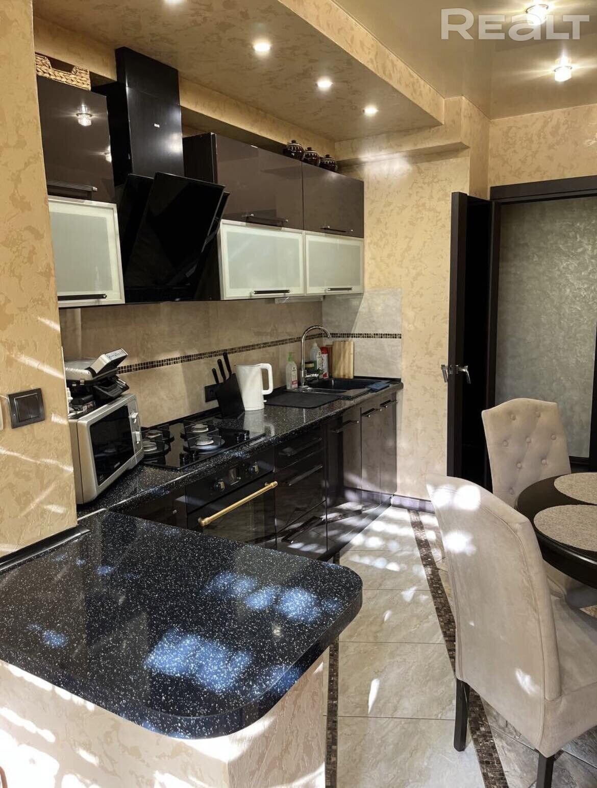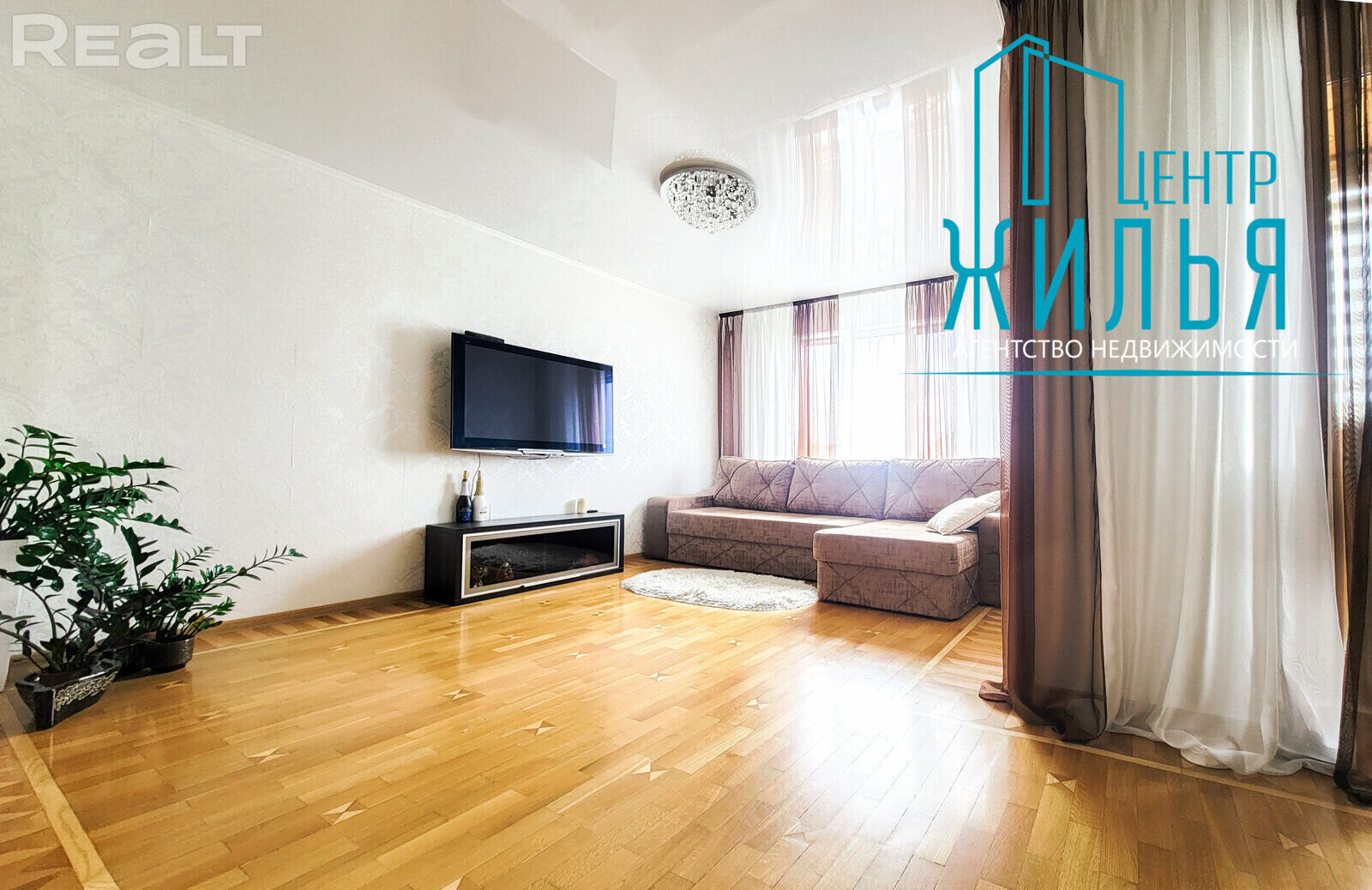 На полу — паркет. Все полы выведены на один уровень. Кухня оборудована встроенной мебелью и техникой: индукционная варочная панель, электрический духовой шкаф, вытяжка. В квартире — две лоджии. В гостиной, кухне и одной из комнат есть телевизоры.