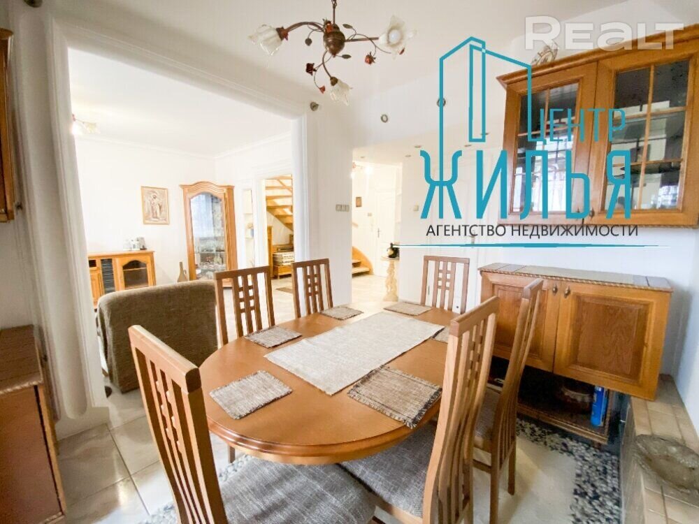 Ремонт выдержан в светлых тонах. В интерьере много дерева — лестница, стол, шкафчики, комоды. Гостиная украшена картинами и декоративными тарелками. За счет зеркальных дверей в шкафе-купе визуально увеличивается пространство. Один из санузлов — с ванной, второй — с душевой кабиной. Каждая комната сделана в своем цветовом решении.