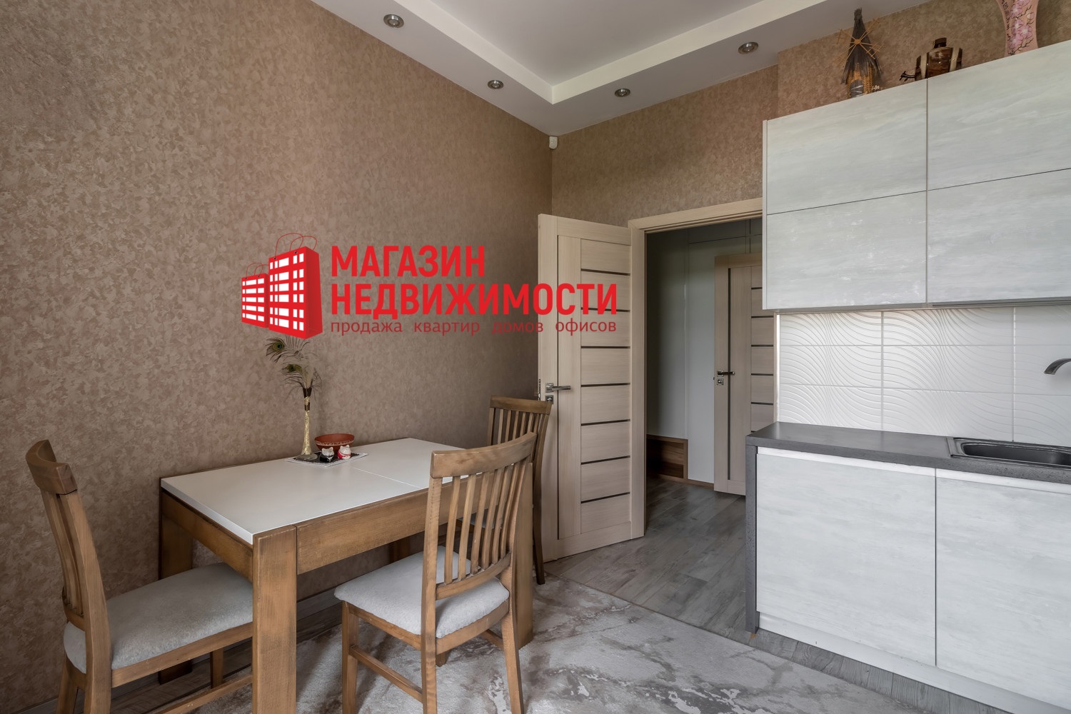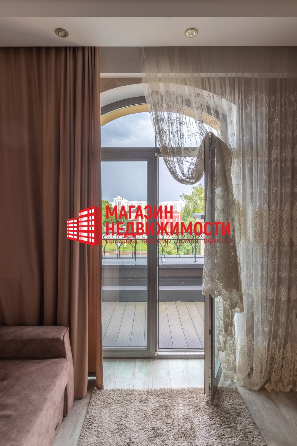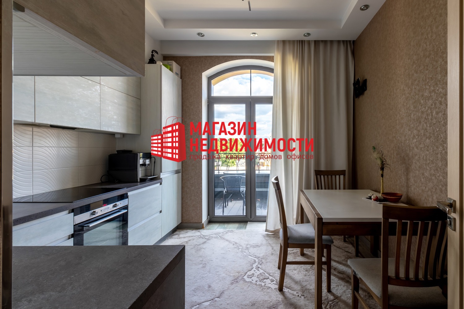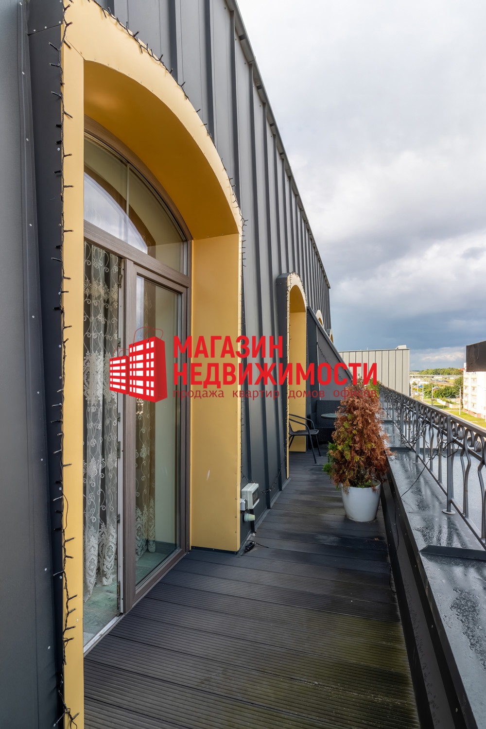 Квартира расположена на последнем этаже пятиэтажки 2018 года постройки. Общая площадь — 59,5 кв.м. Есть терраса на 11,8 кв.м, на которую можно выйти из каждой комнаты. В квартире — окна в пол. Дизайнерский ремонт сделан в теплых светлых тонах. В интерьере много дерева, бежевого и коричневого цветов. В совмещенном санузле — яркие зеленые детали.