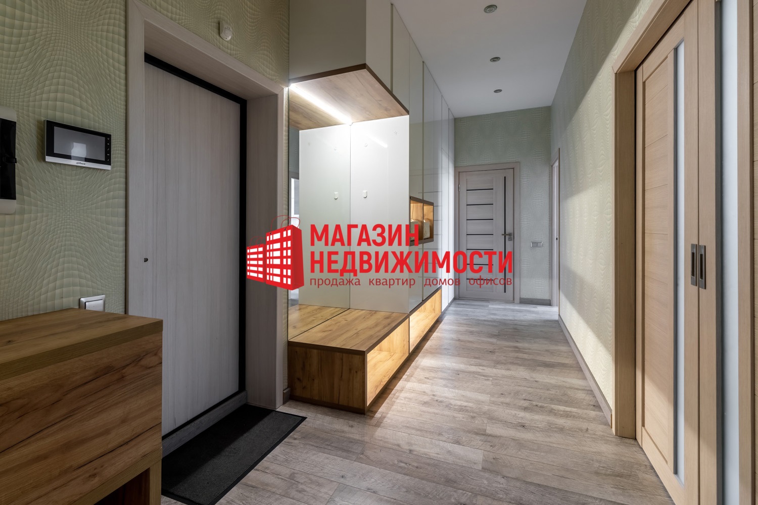 У усиленной металлической входной двери есть видеодомофон с функцией записи. Есть охранная сигнализация.