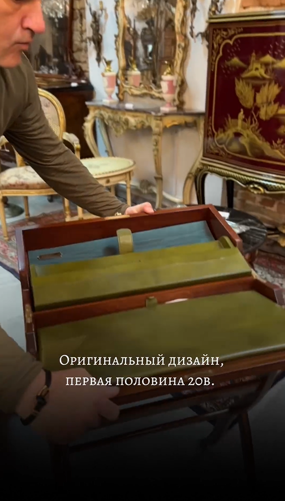 Складной деревянный письменный стол первой половины XX века продают за 750 рублей. Рабочая поверхность обита кожей, в столе есть замок, а в комплект входит нож для писем.