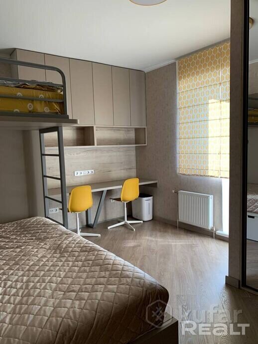 В ремонте использовали современные экологичные материалы. Мебель во всех комнатах изготовлена в едином стиле на заказ. Использовали естественный светлый цвет древесины. Мебели в квартире немного. В одной из комнат — двухъярусная кровать и много местаа для хранения вещей. Во второй — кровать с тумбочками.