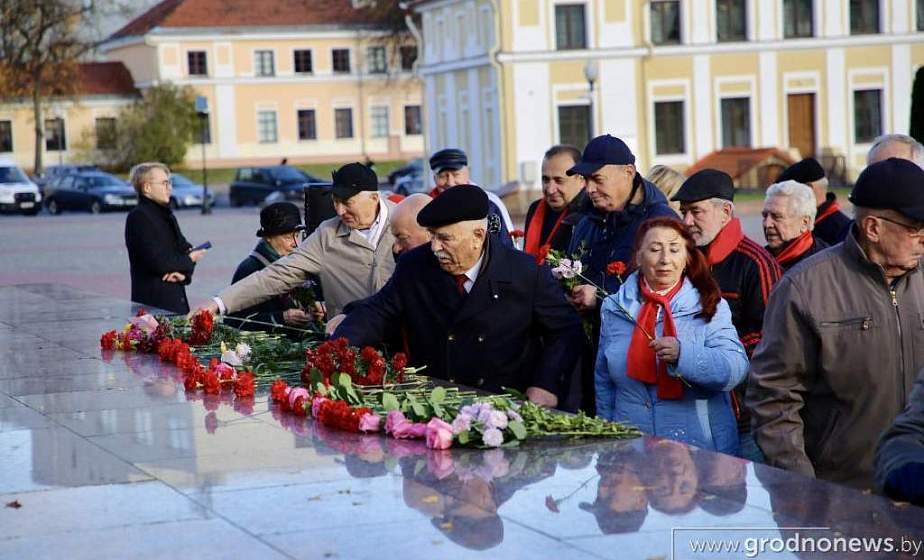 Около 60 человек собрались 7 ноября под памятником Ленину в Гродно, чтобы отпраздновать 106-летие Октябрьской революции. В их руках были не только флаги СССР, ВЛКСМ, современный красно-зеленый государственный флаг, но и флаг условных «либерал-демократов» Гайдукевича.