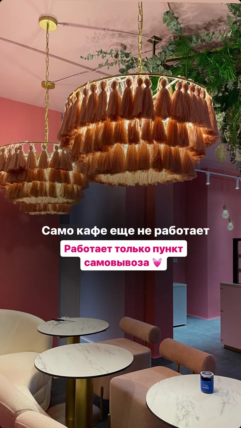 Владельцы Myloverberry провели в помещении существенный ремонт и сменили прежний темно-зеленый цвет на ярко-розовый. В центре кафе теперь с потолка свисают цветы, в зоне ближе к стене — дизайнерские светильники, на самой стене — зеркала. В зале стоят небольшие круглые столики, такие же маленькие белые и розовые мягкие стулья, а также диван, который напоминает облако.