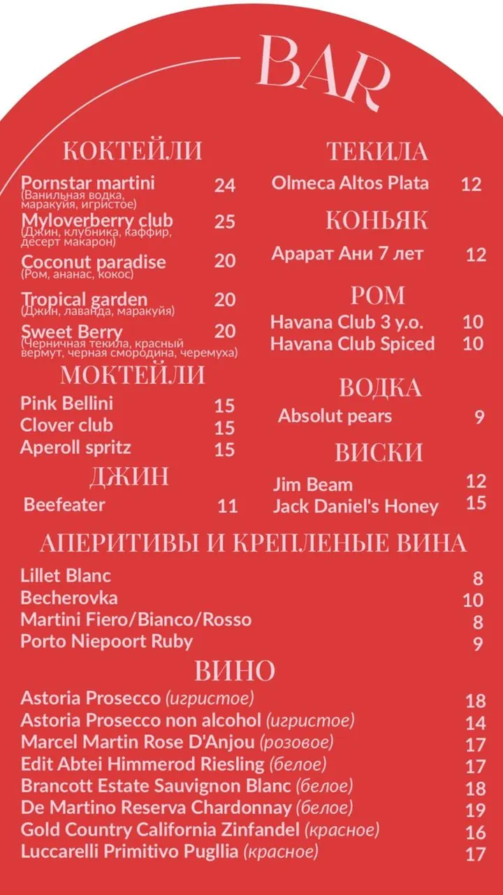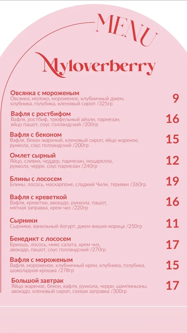 Кафе-кондитерская специализируется на клубнике в шоколаде. Но в меню есть и завтраки, и безалкогольные коктейли, и алкоголь. Завтраки подают целый день. Среди алкогольных напитков есть, например, фирменный коктейль «Myloverberry club». В его состав входит джин, каффир, клубника и десерт макарон.