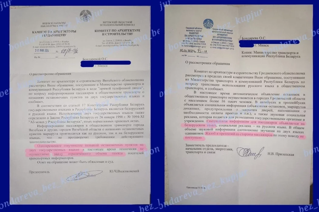 По мнению активистки, такие ответы – дискриминация одного из государственных языков Беларуси. “Вопреки национальному законодательству и Конституции, гарантирующим равноправие государственных языков, налицо факт дискриминации одного из них в транспортной сфере”, — написала Бондарева.