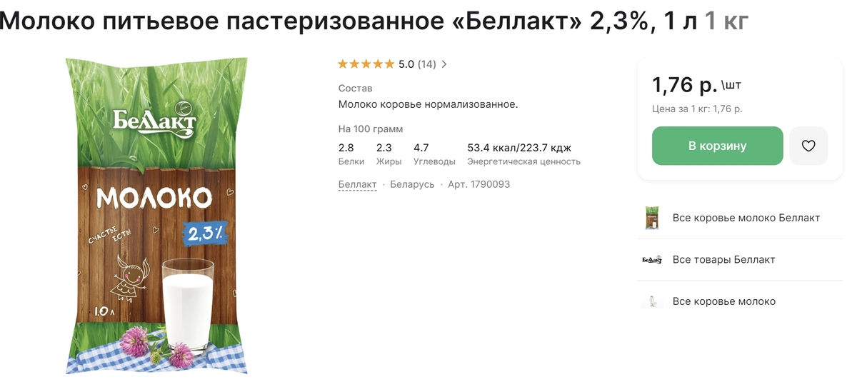 В Беларуси в магазине “Евроопт” самый дешевый литровый пакет молока от “Беллакт” жирностью 2,3% стоит 1,76 рублей. Один литр молока “Савушкин” с жирностью 1,5% стоит в магазине “Евроопт” 2,61 рубля. Литр молока “Беллакт” с жирностью 2,3% в пакете стоит 1,76 рубля, а 3,2% – 2,08 рублей.