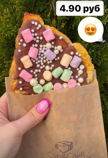 В кофейне Cup&Cake предлагают два вида круассанов. Первый – сладкий с шоколадом и посыпкой из маршмеллоу за 4,90. Второй – соленый, с вялеными томатами, оливками, творожным сыром и рукколой за 7,20 руб. Соленый 2D-круассан подойдет вегетарианцам.