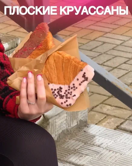 На выбор три вида круассанов продают в кофейне Myloverberry. Здесь вы сможете попробовать только сладкие крунжи, но с разным шоколадом – молочным, розовым или белым. В своем Instagram кофейня поделилась рецептом “плоскости”. Чтобы круассан стал 2D, перед выпечкой его необходимо накрыть пергаментной бумагой и прижать чем-то плоским, например противнем.