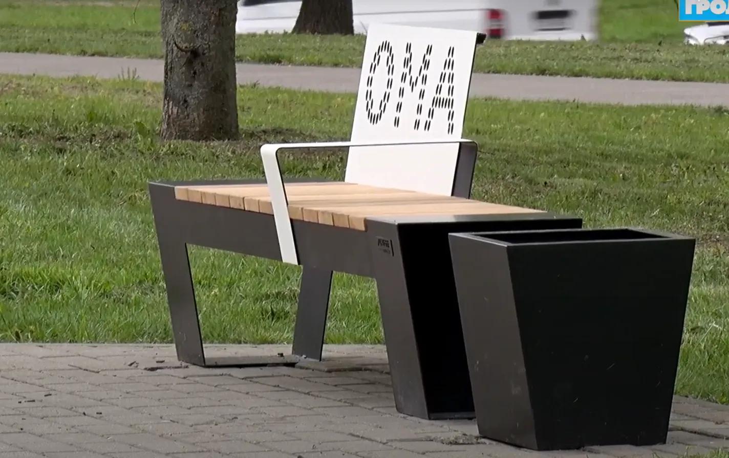 Также в сквере поставили скамейки разных форм, брендированные разными торговыми сетями, и мусорки.