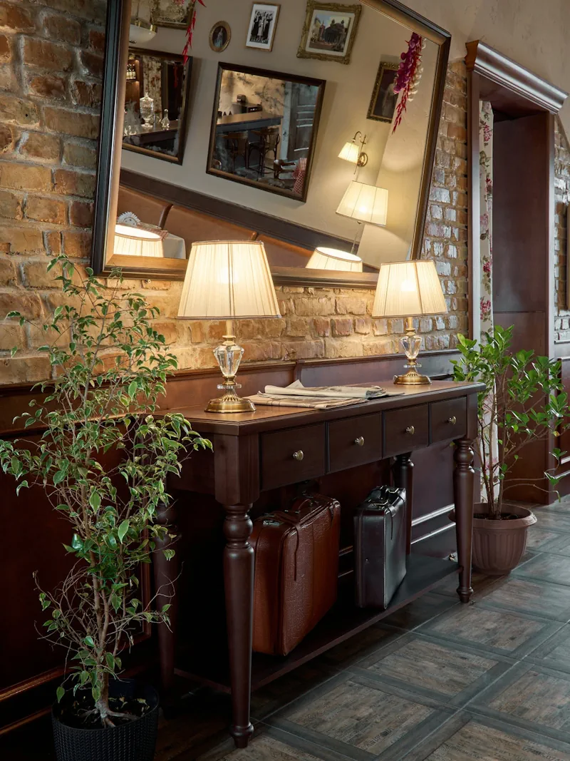 От предыдущего «итальянского» заведения осталась часть интерьеров. Сохранить решили полы, балки на потолке, открытую кирпичную кладку на фрагментах стен. Остальной дизайн разработала минская студия дизайна Екатерины Хотим.