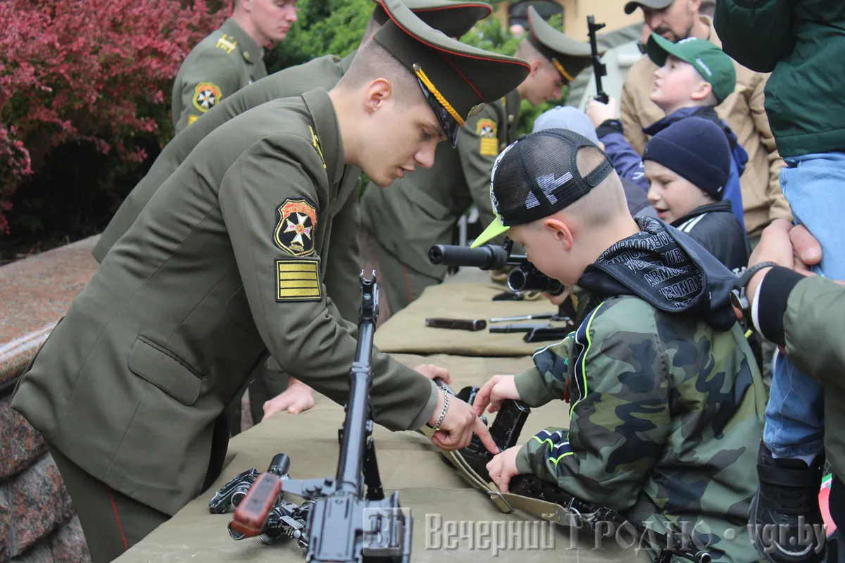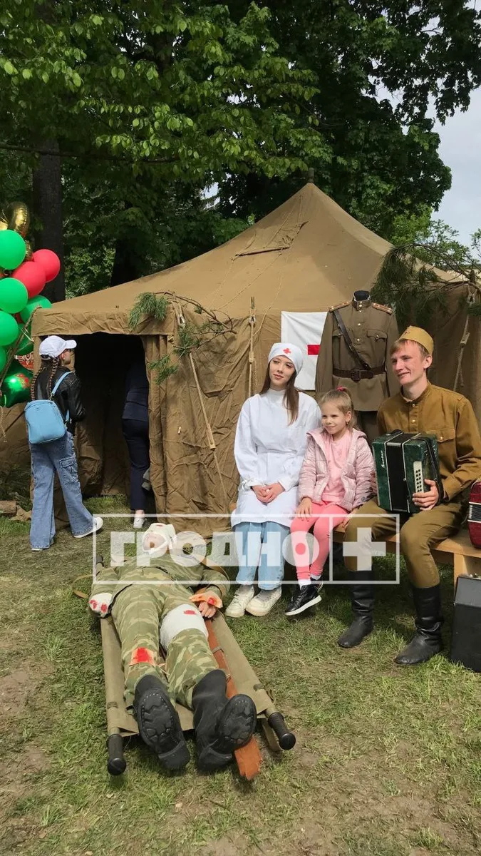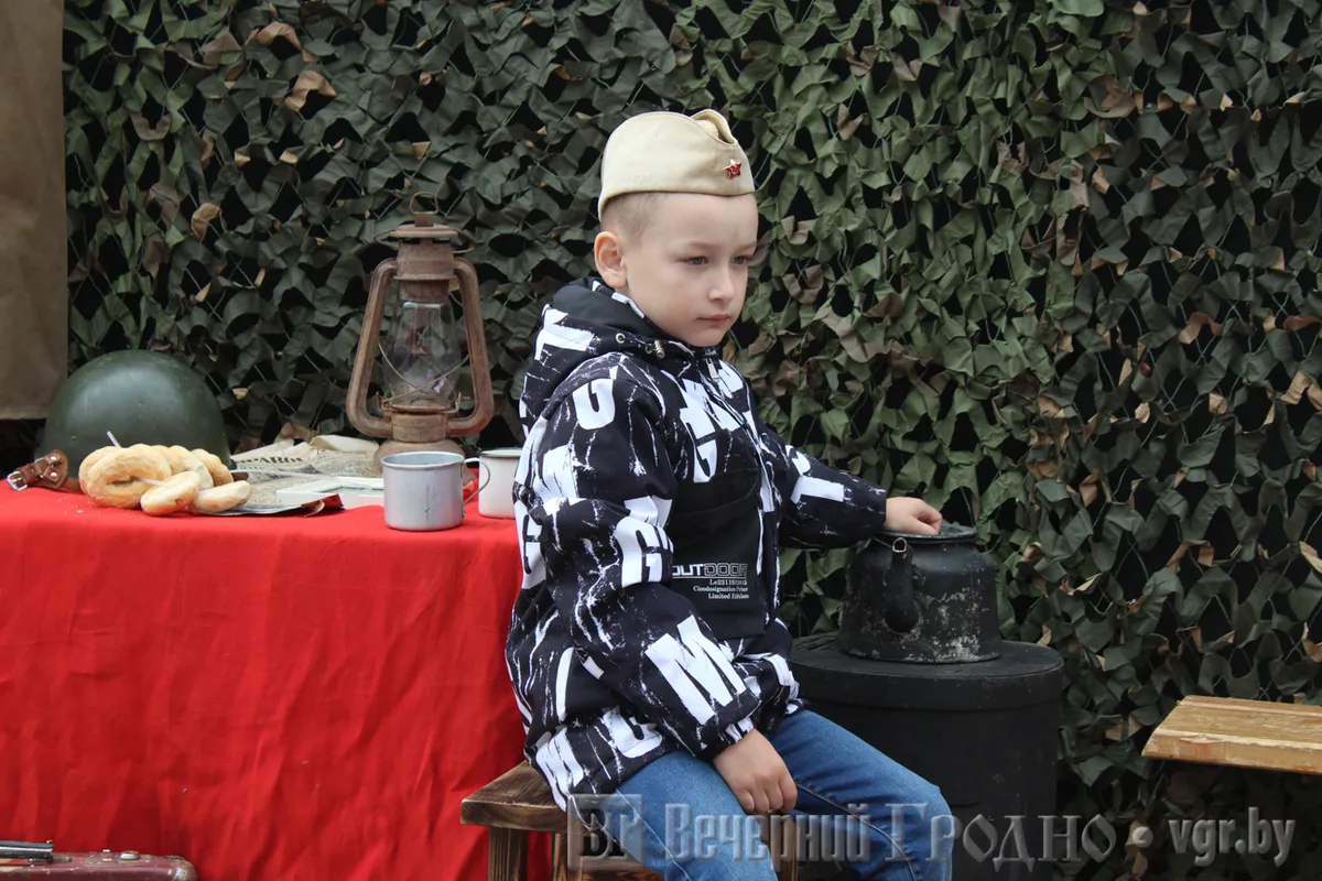 На площади Тизенгауза выставили военную технику. В парке Жилибера поставили «Аллею инсталлированных площадок»: там была и «Медсанчасть» с перебинтованным манекеном с красными пятнами, и «Кино на привале» и «Партизанский лагерь».