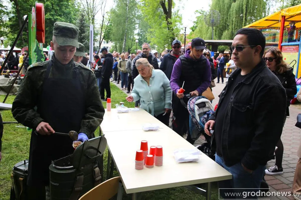 В «Полустанках времени» на Советской гродненцам показали, как выглядел хлеб по талонам. За «солдатской» кашей разных видов выстроилась большая очередь. Кашу раздавали в одноразовых стаканчиках.