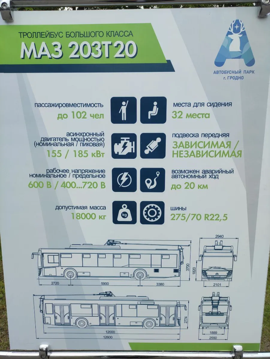 Судя по информационной табличке, привезли троллейбусы большого класса MA3 203T20. Пассажировместимость такой машины — до 102 человек, сидячих мест — 32. Допустимая масса — 18 тонн. Двигатель асинхронный, мощностью 155/185 кВт (указаны номинальная и пиковая).