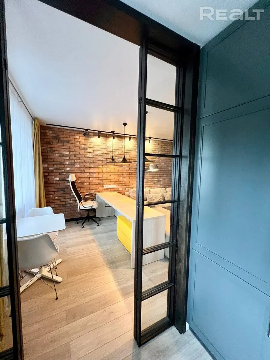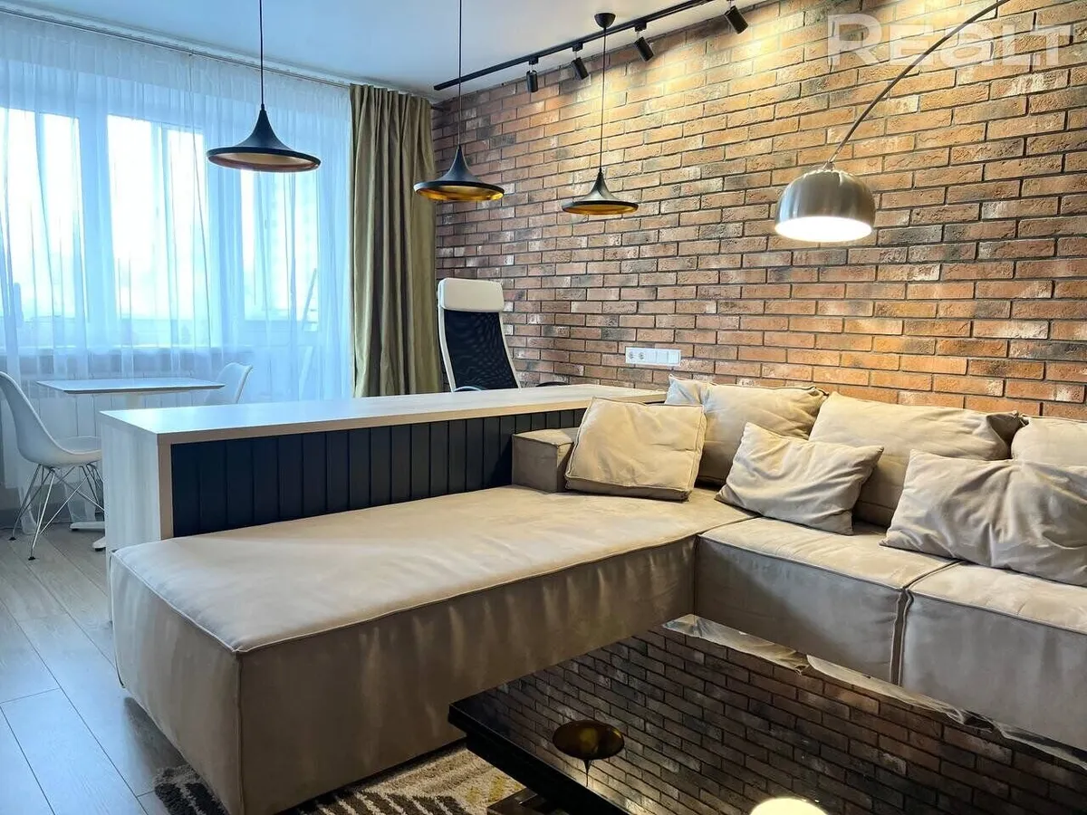 Квартира расположена на последнем этаже пятиэтажки. Ее площадь — 43.4 кв.м. В прихожей положили теплый пол. Стены отделали декоративным кирпичом. На полы уложили ламинат, в совмещенном санузле — керамогранит. Установили новую газовую колонку — можно не бояться отключения горячей воды. Во время ремонта залили стяжку пола и выровняли стены и потолки. Также поменяли сантехнику и электрику. Добавили много точек освещения и проходные выключатели.