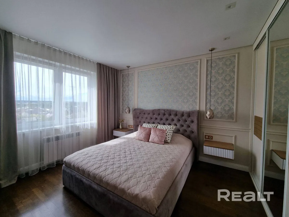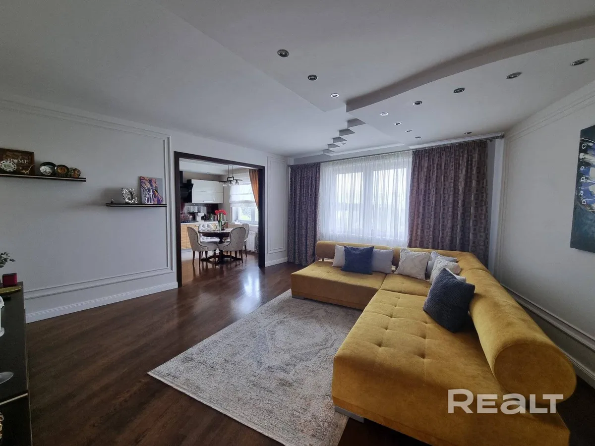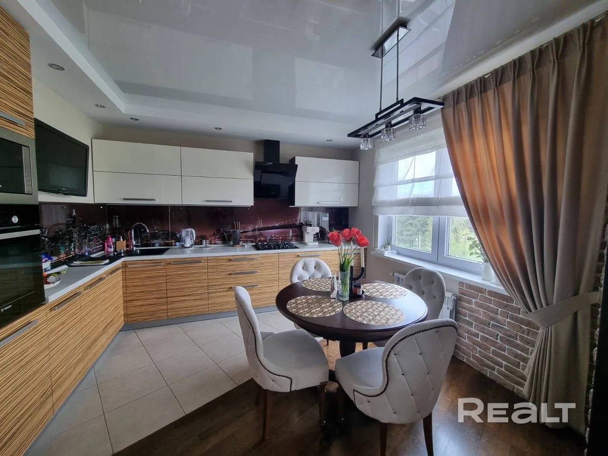 Четырехкомнатная квартира с дизайнерским ремонтом по ул. Советских Пограничников, 122 продается в Гродно. Вид из квартиры — на лесопарк Лососно. Мебель сделали на заказ. Текстиль на окнах делали на заказ дизайнеры.