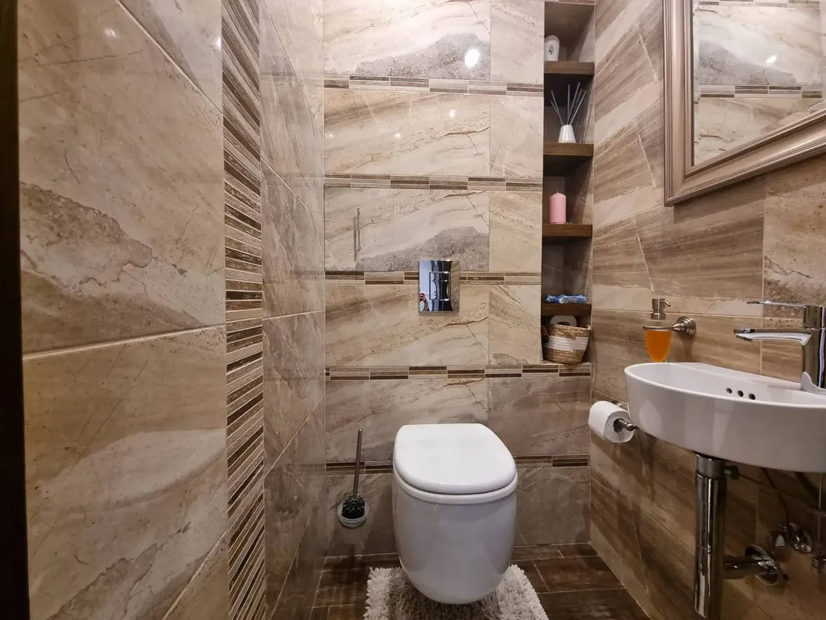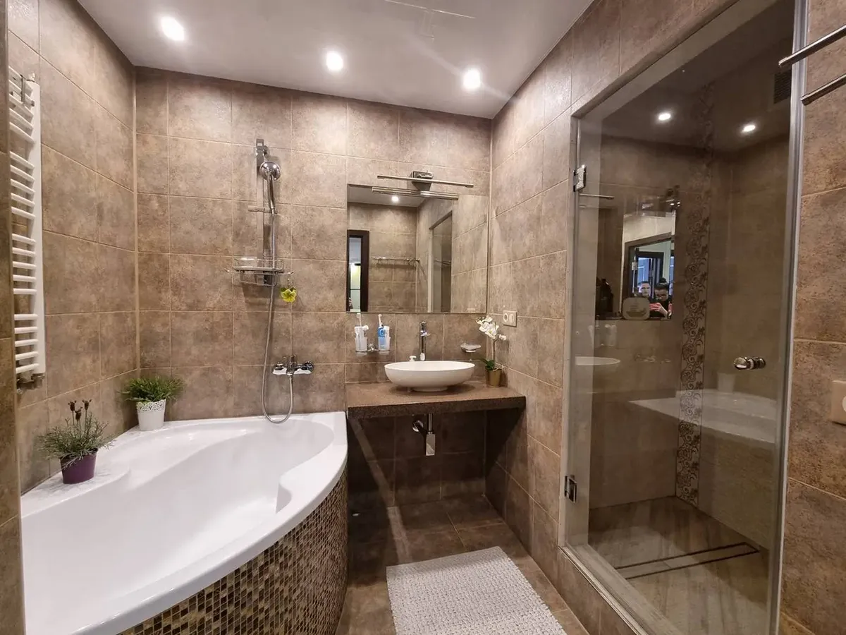 Общая площадь — 103,8 кв.м. На полы в комнатах уложили дубовый паркет. Кухня оборудована встроенной техникой Bosch и Samsung. Санузел — раздельный. Сантехнику брали немецких производителей. В лоджиях теплые полы.