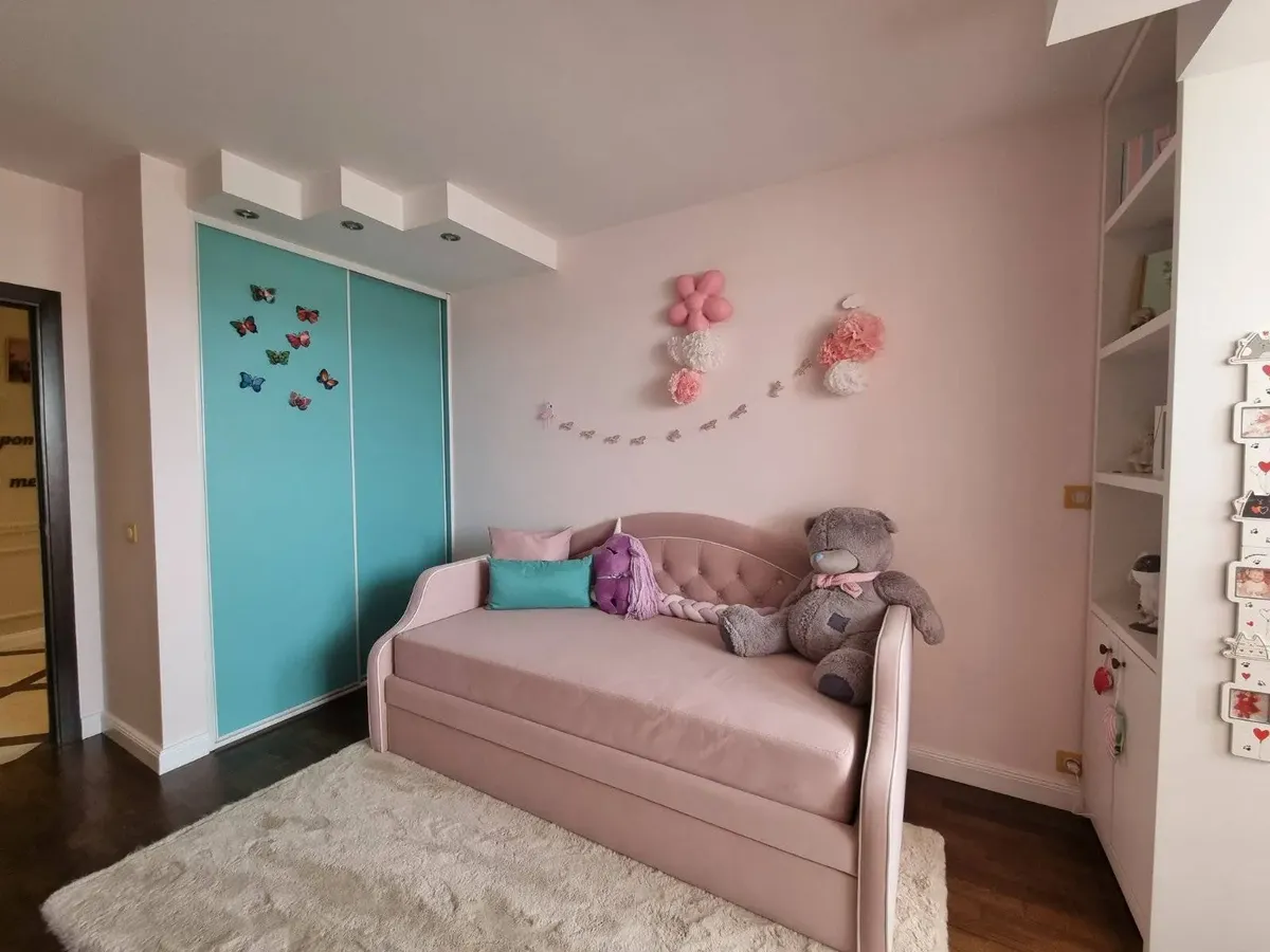 В кухне сделали открытую кирпичную стену. В зале — большой диван, открытые полки для хранения и декора. Одну из комнат отдали под спальню. Вторая — розовая “девчачья” детская с разрисованной стеной. Оттуда есть выход на лоджию. Еще одну комнату отдали, видимо, под гостевую. Там диван, телевизор и еще одна лоджия. Еще один телевизор — на кухне. В большой прихожей есть места для хранения — командор.