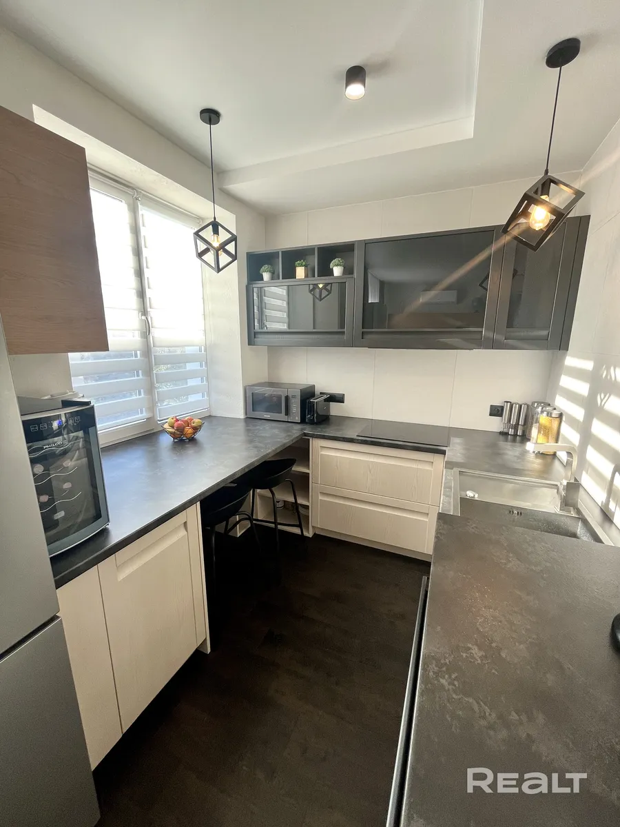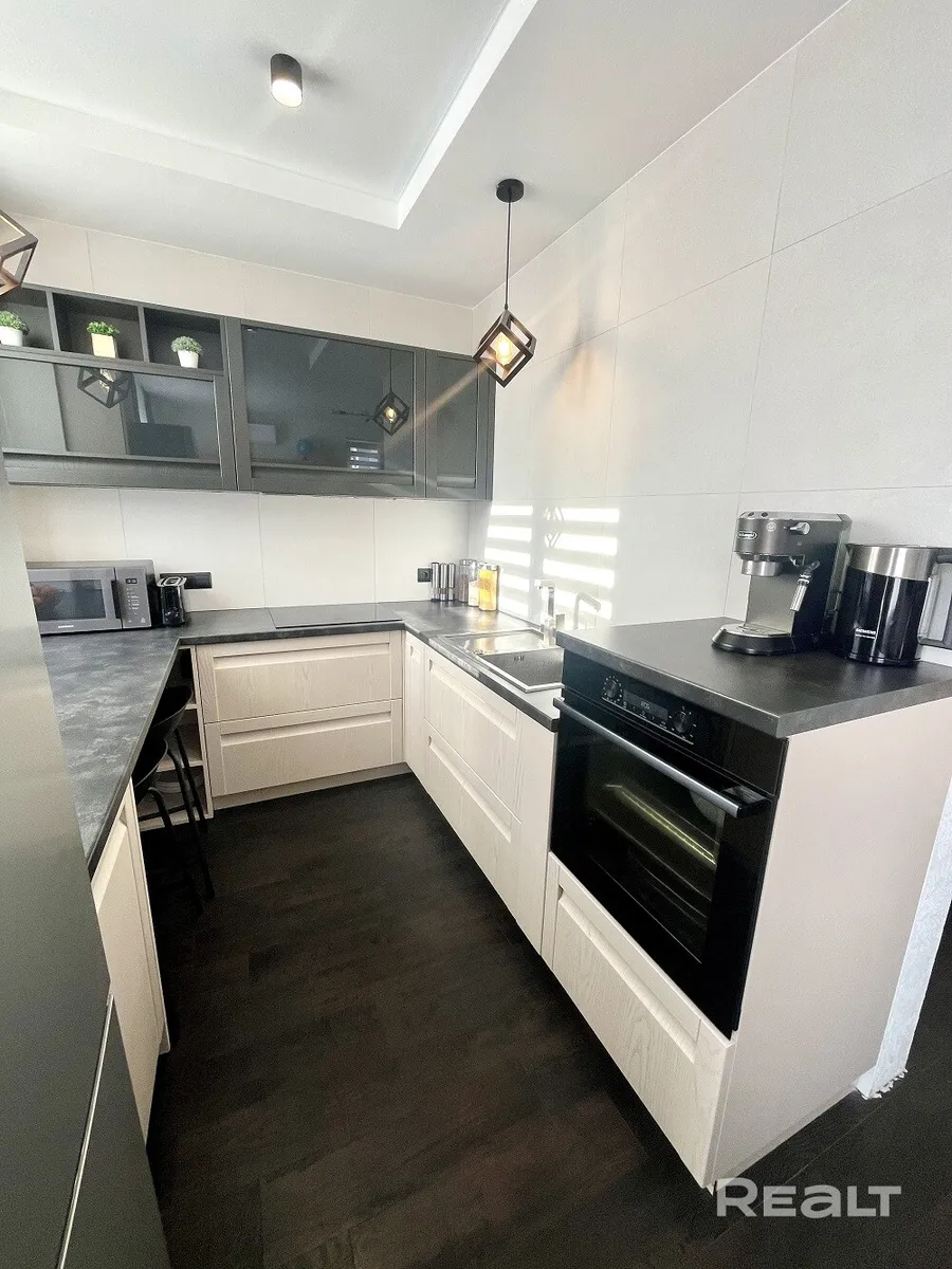 На полы уложили кварцвинил (водостойкое напольное покрытие — Hrodna.life) бельгийского производства. На стенах – декоративная штукатурка. Встроенная кухня сделана из массива ясеня. Есть посудомоечная и кофе- машины.