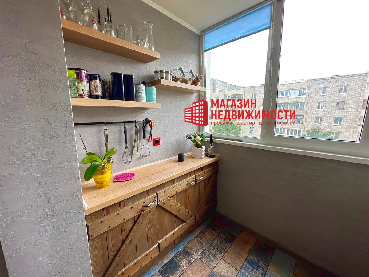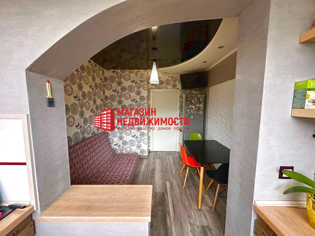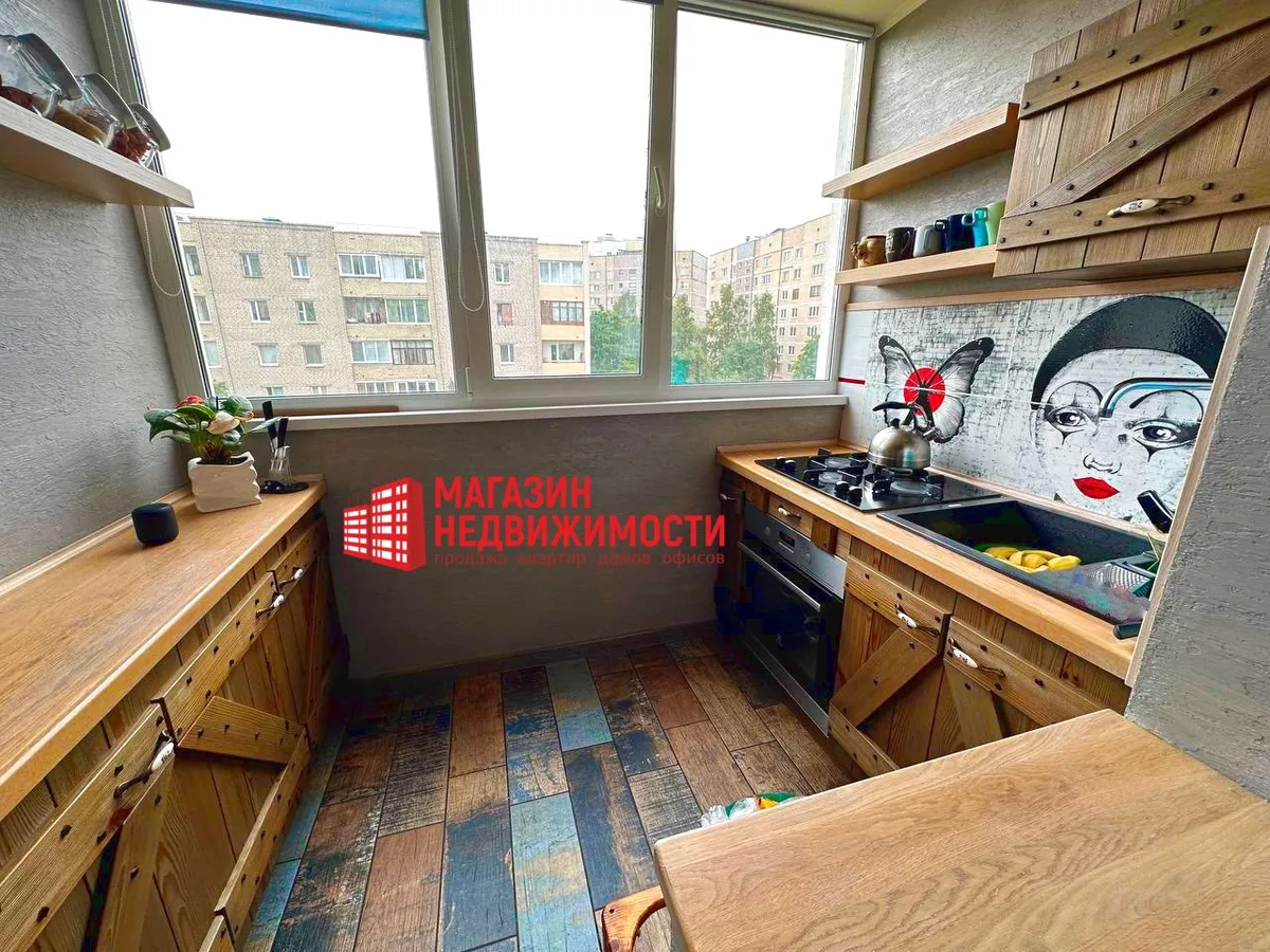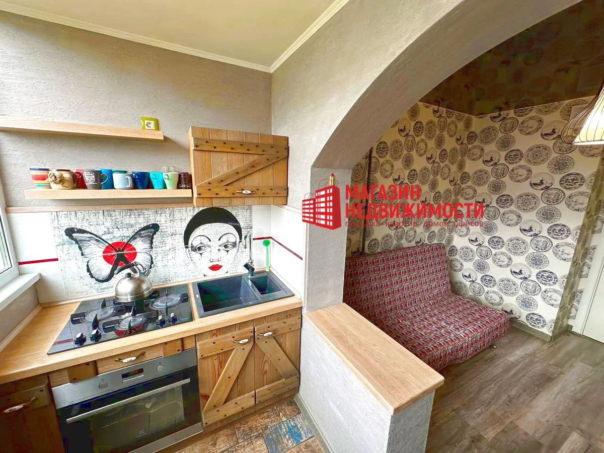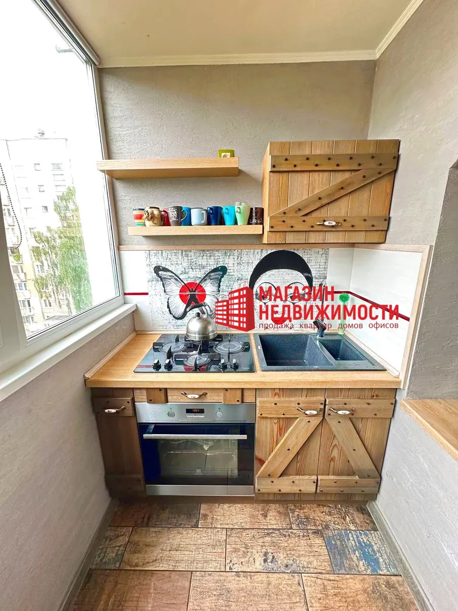 В Гродно продается однокомнатная квартира на улице Щорса. Кухню в ней увеличили за счет лоджии на 2,7 кв.м. Туда перенесли плиту, мойку и шкафчики, фактически сделав кухню гостиной. Квартира продается с мебелью и техникой.