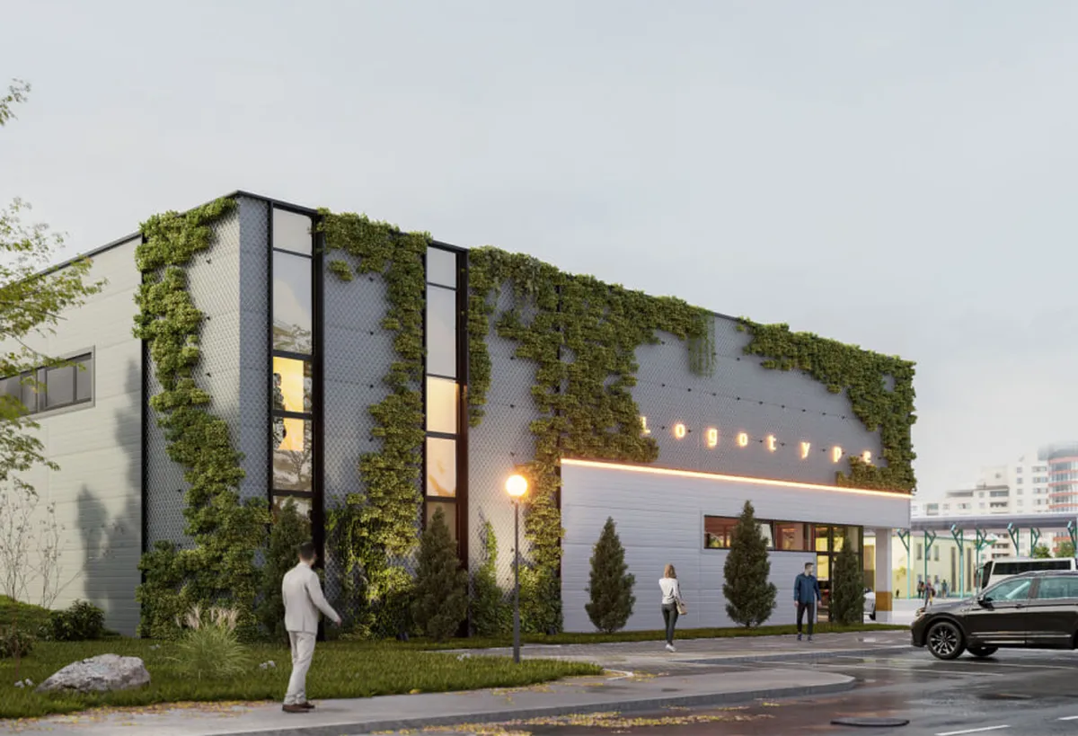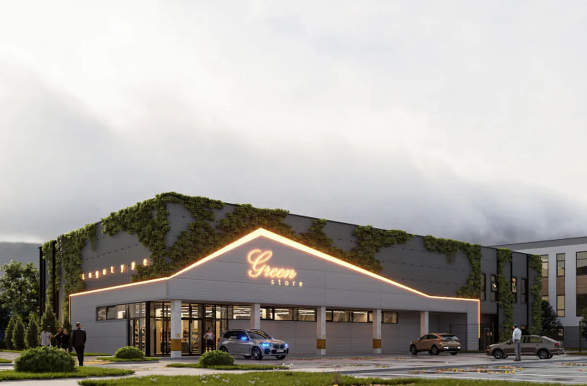 Особенность торгового центра в том, что на фасаде здания планируют разместить вертикальное озеленение. Для него используют декоративную фасоль и декоративный плющ. Для Гродно это новая идея, как пример такого озеленения в городе можно привести разве только главный корпус Гродненского государственного университета имени Янки Купалы на улице Ожешко.