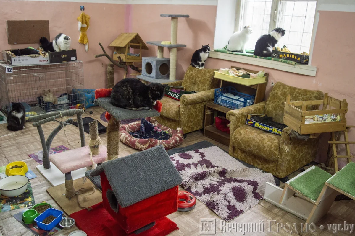 В помещениях были предусмотрены четыре комнаты для комфортного проживания около 40 животных. В общем зале есть домики, шезлонги, игрушки, самодельные лестницы и горки, которые спроектировала одна из волонтерок.