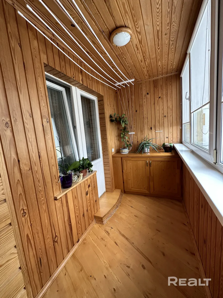 Спальня светлая, на потолке – люстра-букет. Из спальни есть балкон, полностью обшитый деревянной вагонкой.