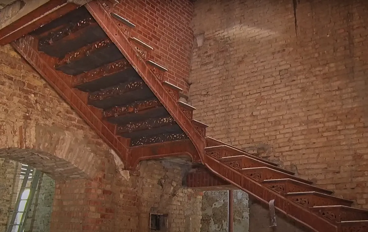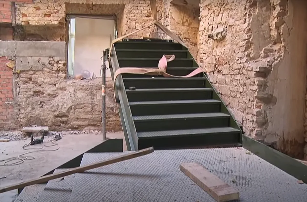 В главном корпусе монтируют металлическую лестницу. Она будет массивной, чтобы подчеркнуть промышленную историю здания. Одновременно монтируют и ажурную лестницу более раннего периода. Они обе помогут гостям оценить разные этапы существования здания.