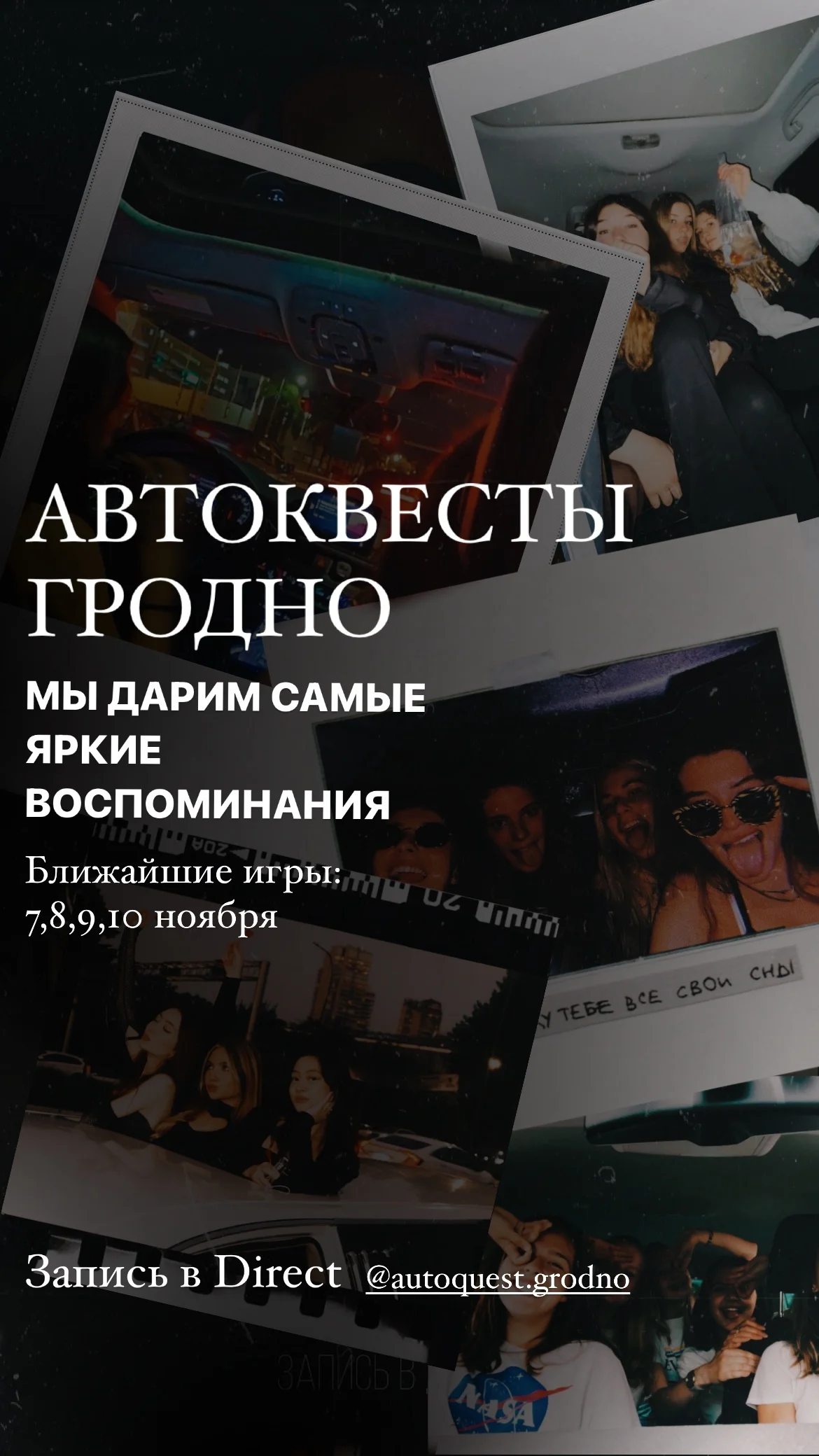 Все выходные, с 7 по 10 ноября, можно будет попасть на гродненский автоквест. В ходе игры участникам надо будет выполнить 10 заданий и отыскать столько же локаций. Организаторы обещают бесконечное количество эмоций и азарта. Для регистрации на квест достаточно связаться с организаторами в Instagram.