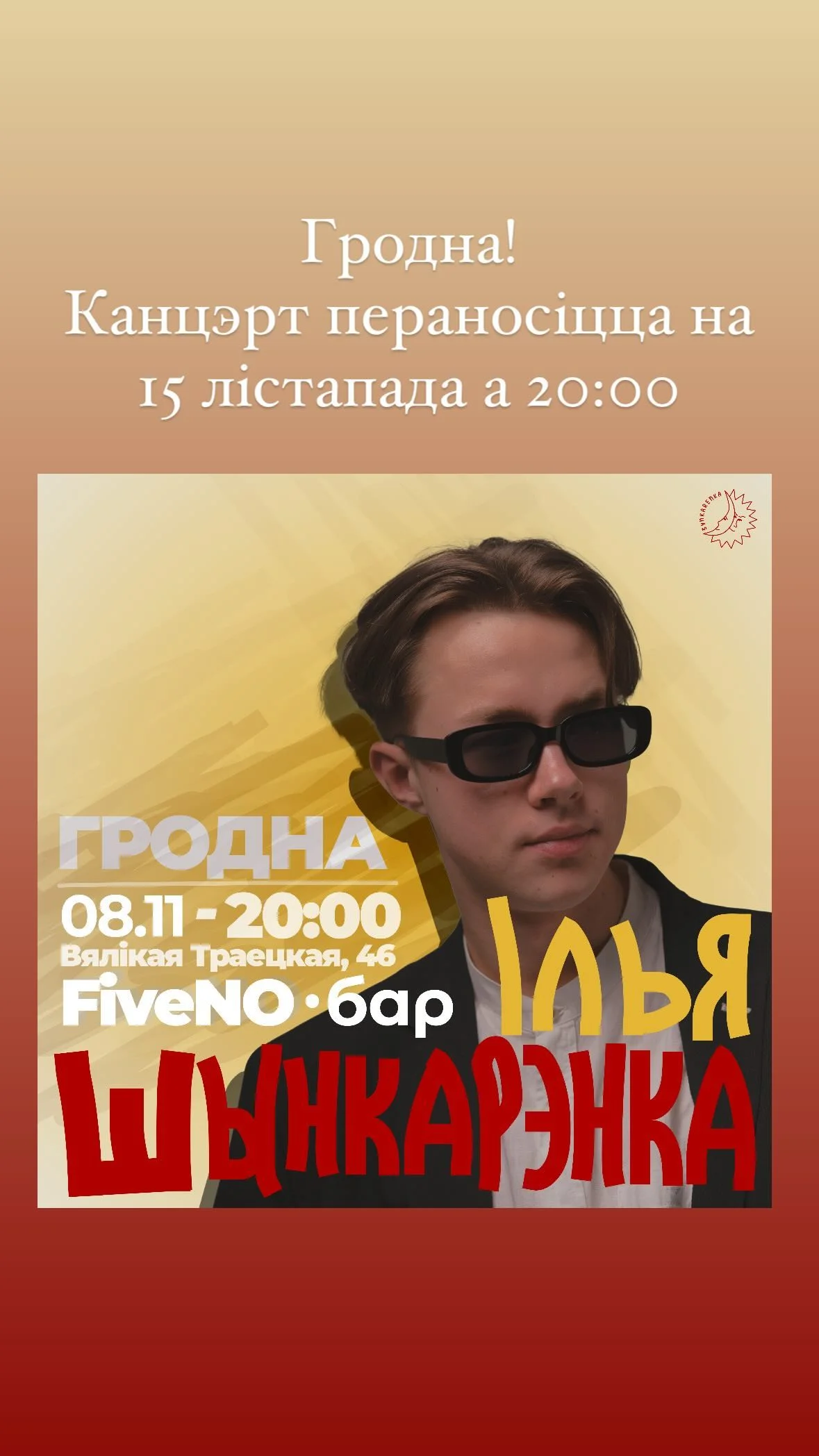 Изначально сообщалось, что звезда белорусского TikTok Илья Шинкаренко выступит с концертом 8 ноября. Однако за два дня до мероприятия в Instagram музыканта появилось объявление, что в Гродно он приедет 15 ноября.