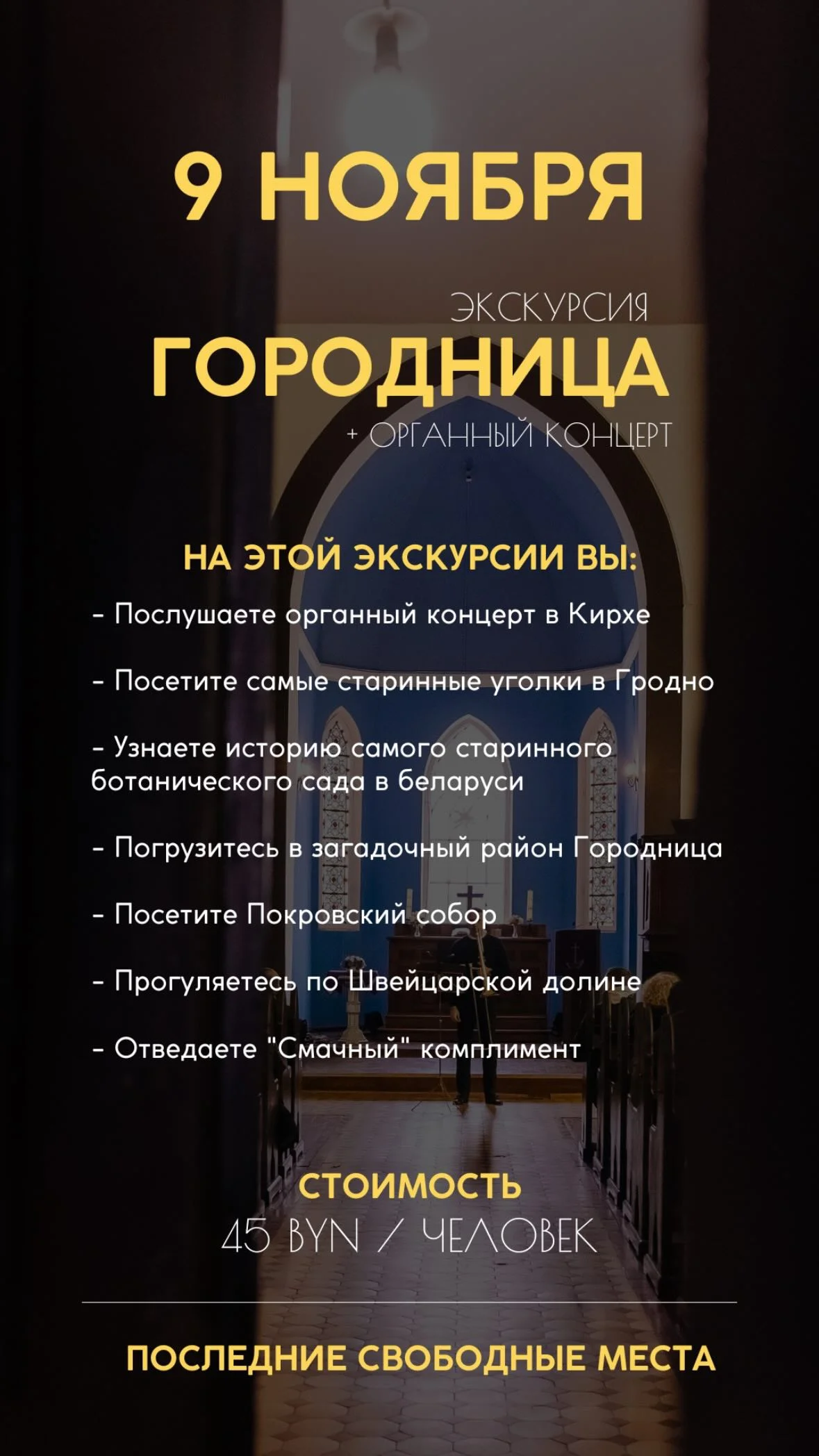 Театрализованную экскурсию по Городнице проведут организаторы «Тайны Гродно». В программе — органный концерт в кирхе, прогулка по старинным уголкам города, посещение Покровского собора и «смачный» комплимент.