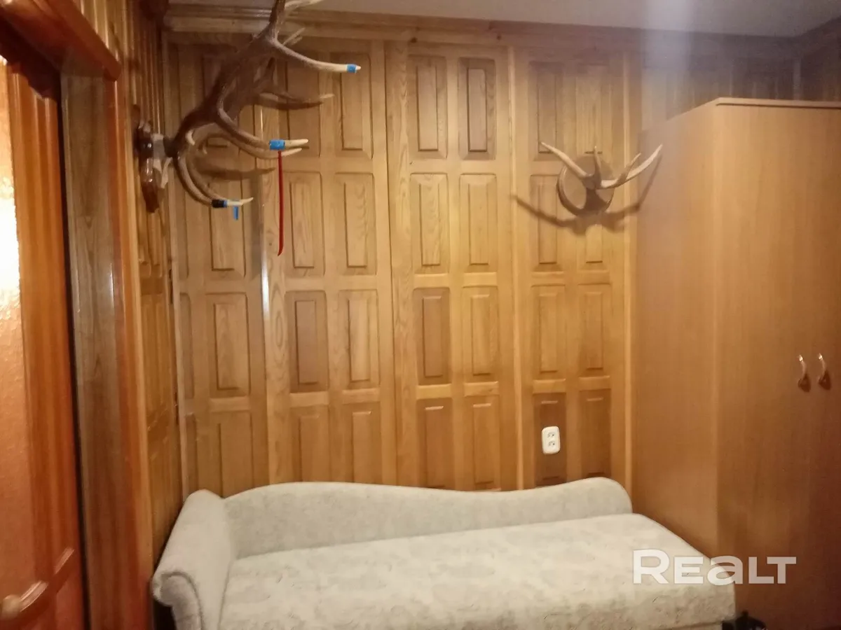 Квартира продается частично с мебелью (конечно же, деревянной) и техникой. Даже зеркало в одной из комнат — в массивной круглой деревянной раме. Интерьер дополняют рога на стене. Люстры и светильники по эпохе гармонируют с остальным интерьером.