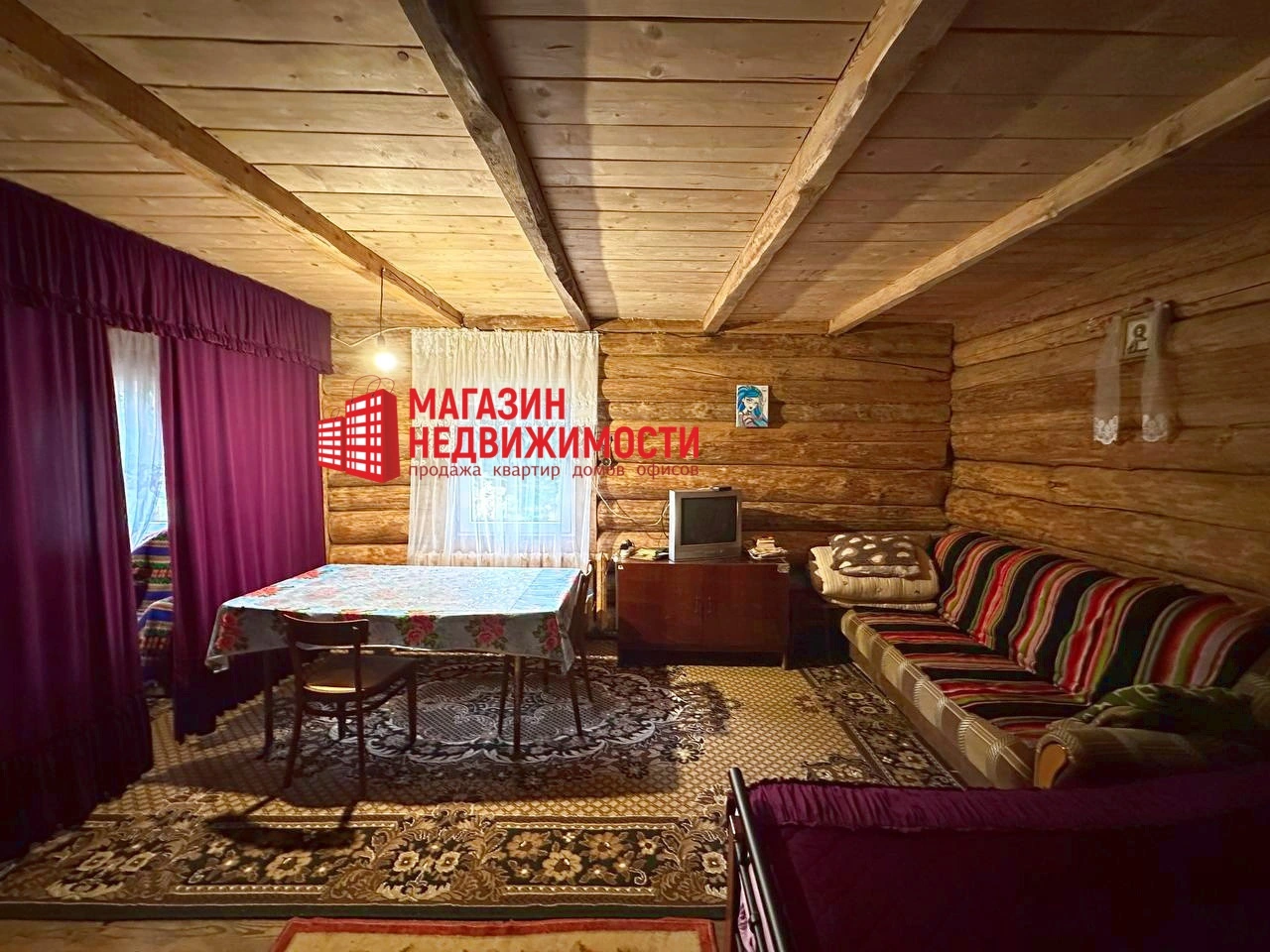 Площадь дома составляет 74 кв.м., из них 40 кв.м. — жилые. Внутренние стены и полы помещения деревянные, есть мебель и бытовая техника: холодильник, плита и телевизор.