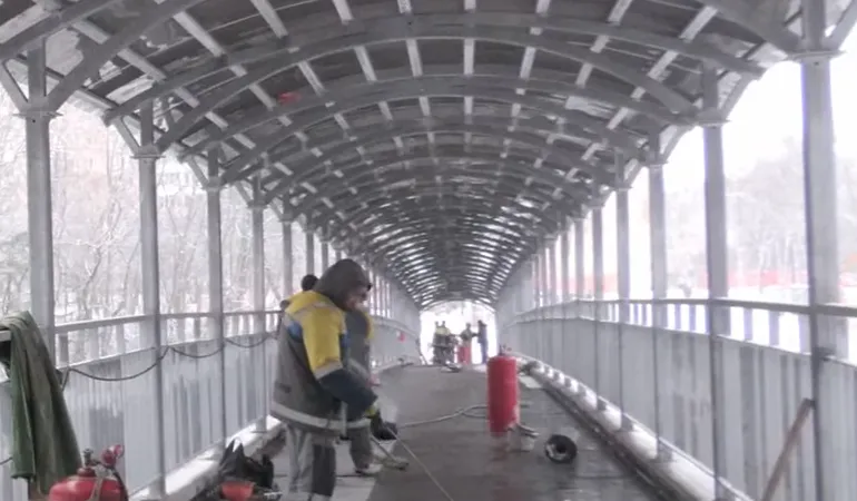 Крышу на мосту уже завершили, сообщили на «Гродно Плюс». 73 м виадука накрыли монолитным поликарбонатом. Сейчас идёт укладка гидроизоляции, которая защитит мост от коррозии и продлит срок его службы. Затем на покрытие моста уложат плитку. Параллельно монтируют пандус и лестницы. На мосту будет освещение — как наружнее, так и внутренняя подсветка. Ширина моста — 3 м.