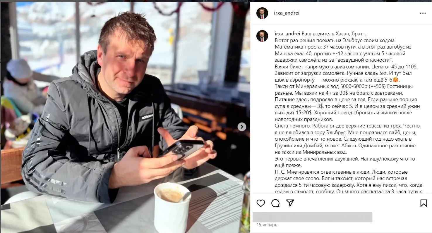 Украденное фото относительно свежее — Андрей опубликовал его 15 января в посте о поездке на Эльбрус.