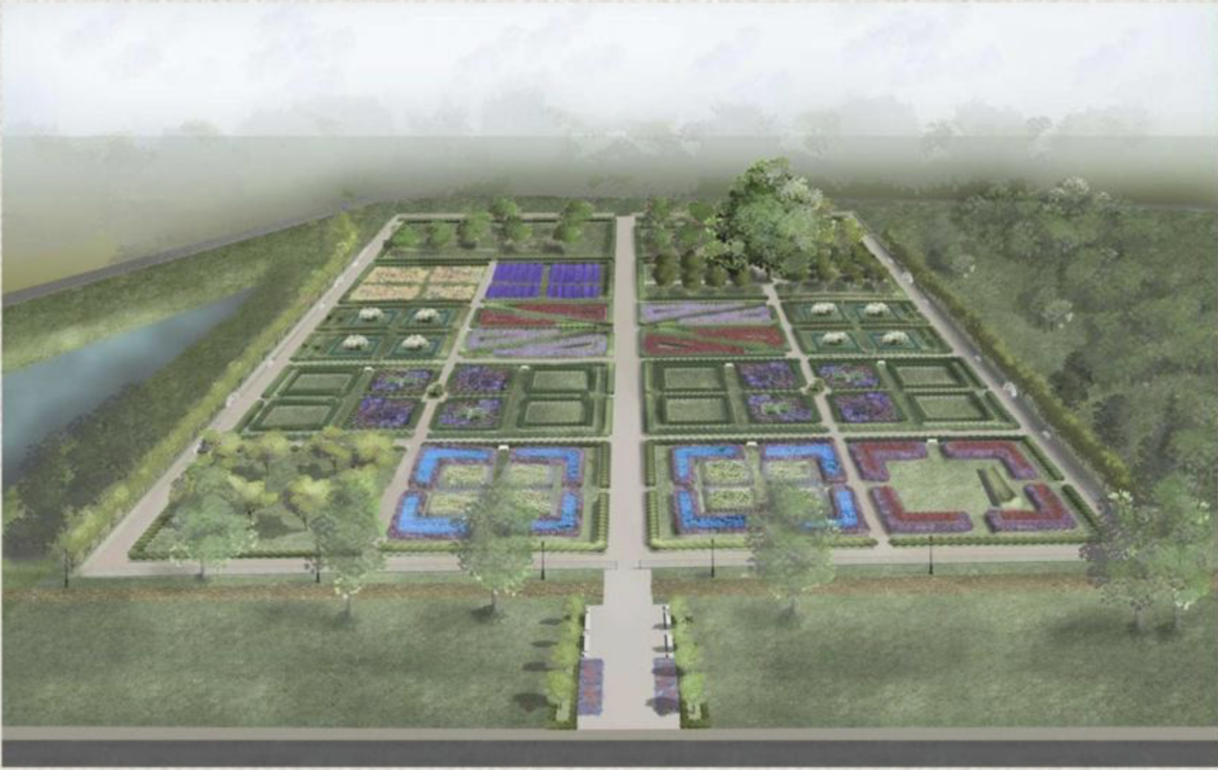 При создании сада специалисты будут соблюдать аутентичную планировку. Так сад будет располагаться ступенями, а его поверхность поделят диагональными и прямыми дорожками. Также должен появиться водоем и фонтан с цветниками или мощеной площадкой.