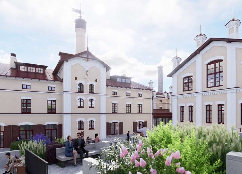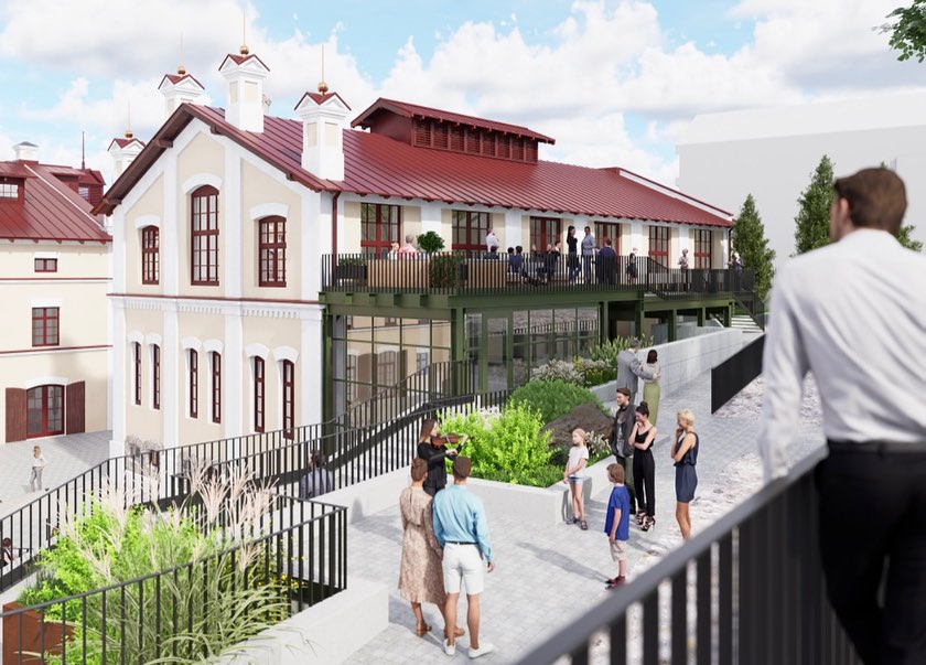 На визуализациях исторические здания преобразуются в современное общественное пространство с кафе, офисами и зонами для отдыха. Старые фасады сохранят аутентику: светлая штукатурка, красные крыши, декоративные элементы. Рядом возводятся новые здания с минималистичным дизайном и большими стеклянными фасадами. Они не мешают старой архитектуре, а создают гармоничный контраст.