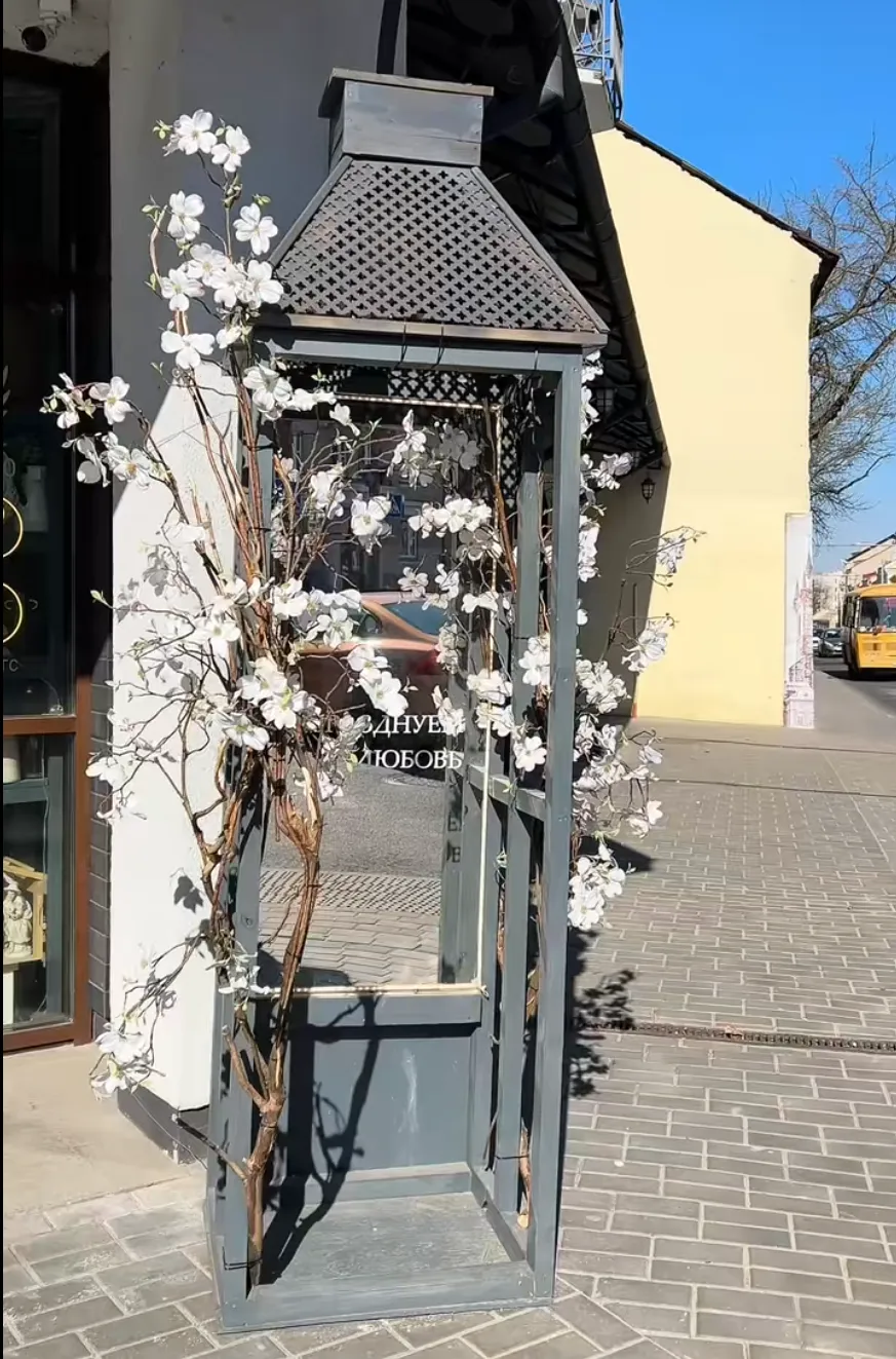 Украшения у входа в магазин цветов и декора Angel to Angel на Большой Троицкой уже стали традицией. Сейчас там установили высокую серую конструкцию в виде фонаря или будки, украшенную белыми цветами — похоже, яблони — и лозой. Внутри — зеркало с надписью «Празднуем любовь». Фотозона получилась стильной и нежной.