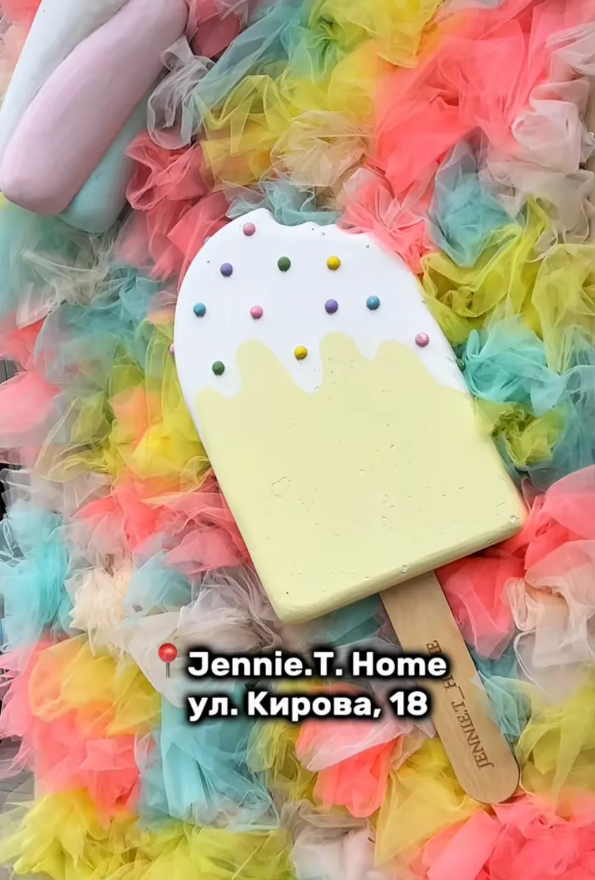 Вся пристройка со входом в магазин сладостей и подарков Jennie.T. Home укрылась под пышными облаками из тюля ярких цветов: розового, жёлтого, бирюзового и кремового. Среди них — декоративные десерты: мороженое, макаруны и ярко-розовый пряничный домик с ёлочками. Рядом, как и зимой, сидит большой белый плюшевый медведь и будто ждет, чтобы с ним кто-нибудь сфотографировался.