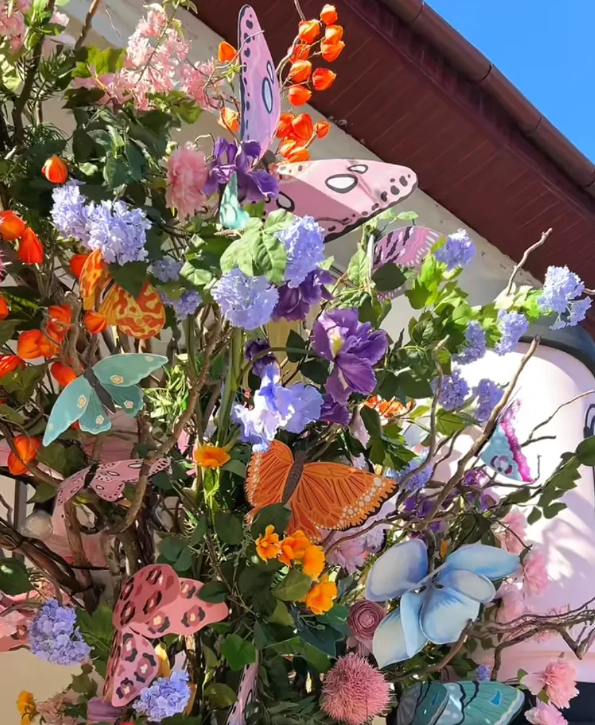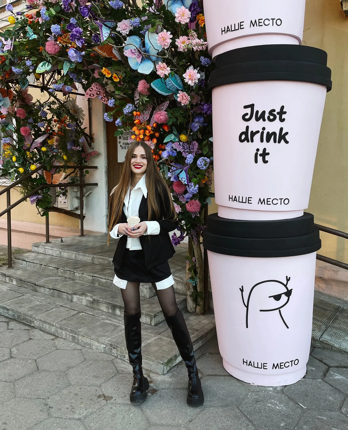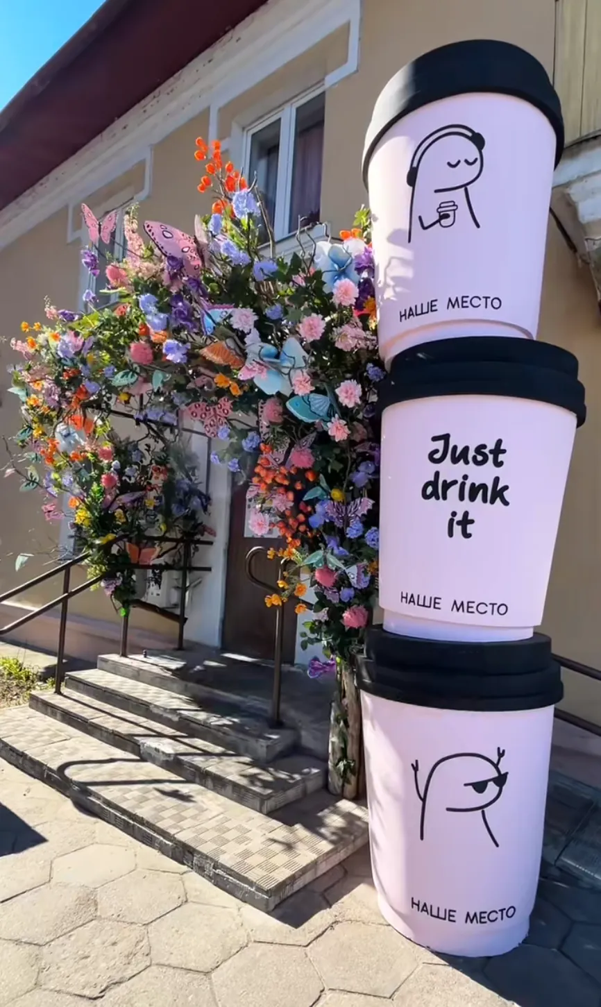 Огромная пышная арка из полевых цветов и бабочек украшает вход в кафе «Наше место» на Дарвина. Рядом поставили три огромных розовых стакана для кофе — композиция заряжает на бодрость. На одном из которых написано: «Just drink it». Контраст яркого декора с нейтральным фасадом здания делает зону особенно фотогеничной.