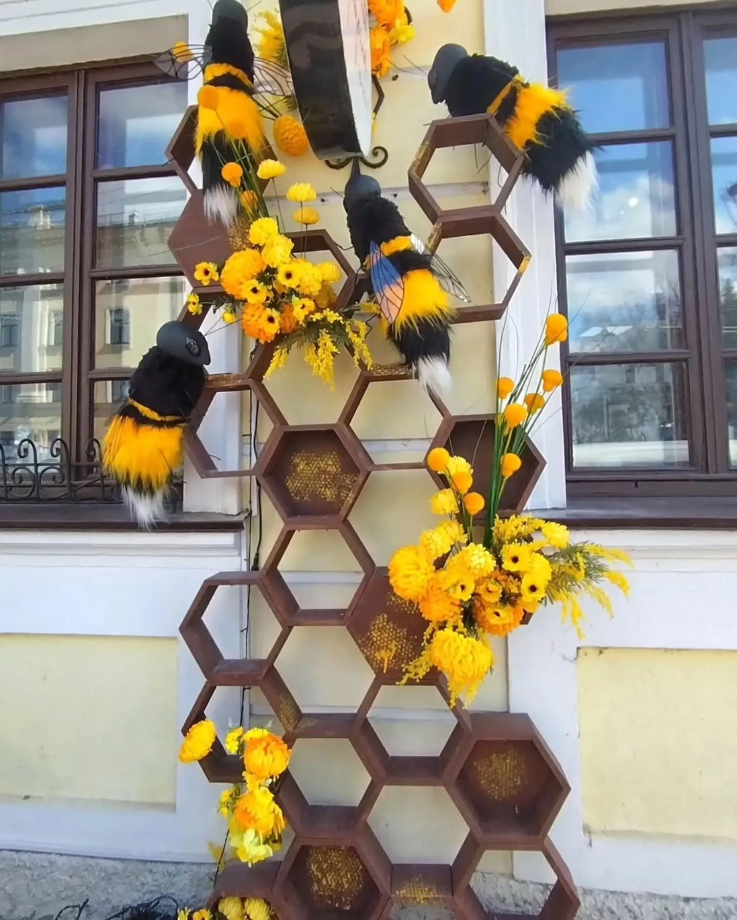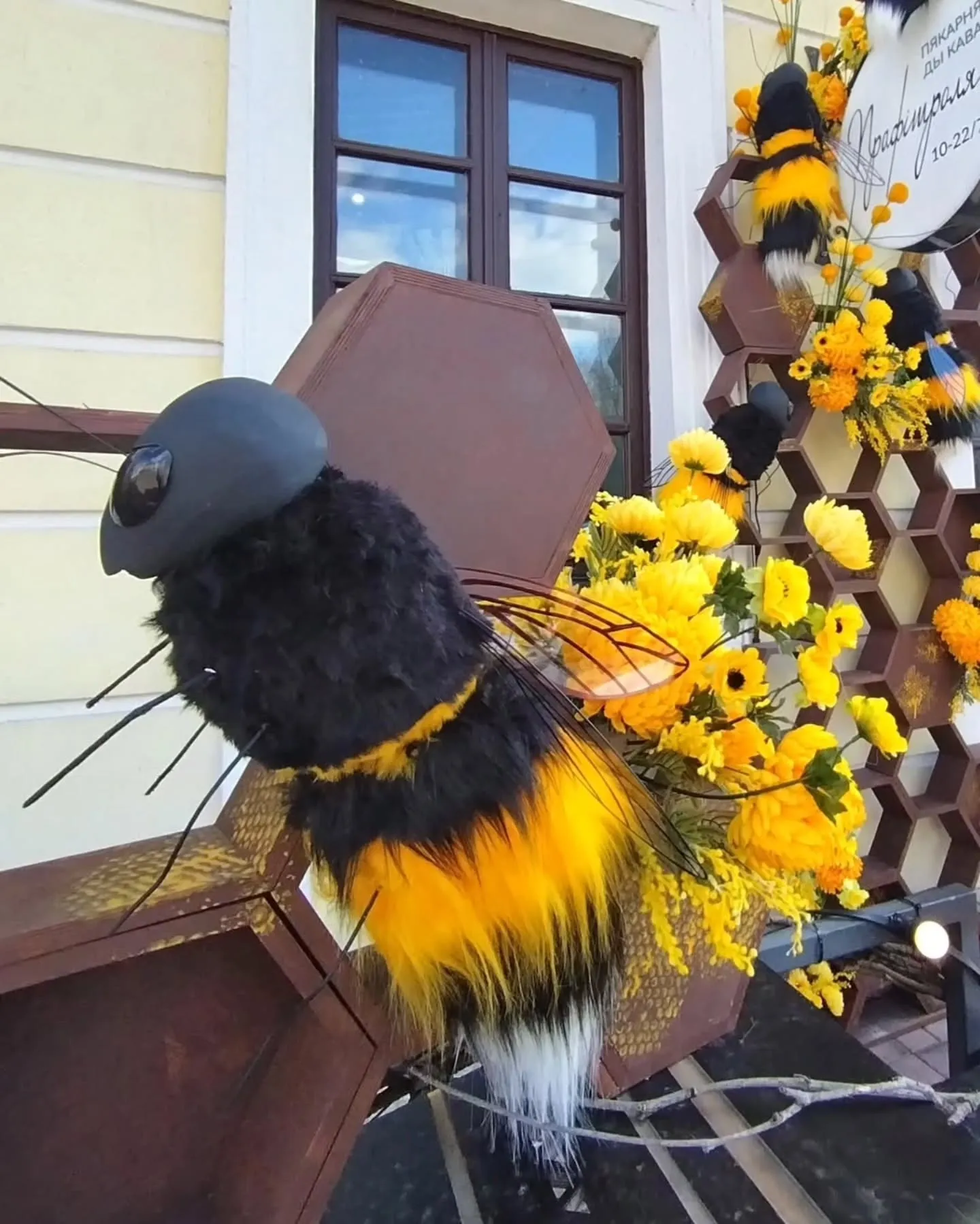 Кафе-пекарня «Прафiтроля» на Советской также традиционно украшает вход со сменой сезонов. Этой весной там появились большая «медовая» инсталляция: коричневая конструкция в виде сот, из которых выглядывают пушистые шмели с крылышками. Между ними — ярко-жёлтые цветы и декоративная пыльца. Композиция создает ассоциации с теплом, сладостями и весенним настроением.