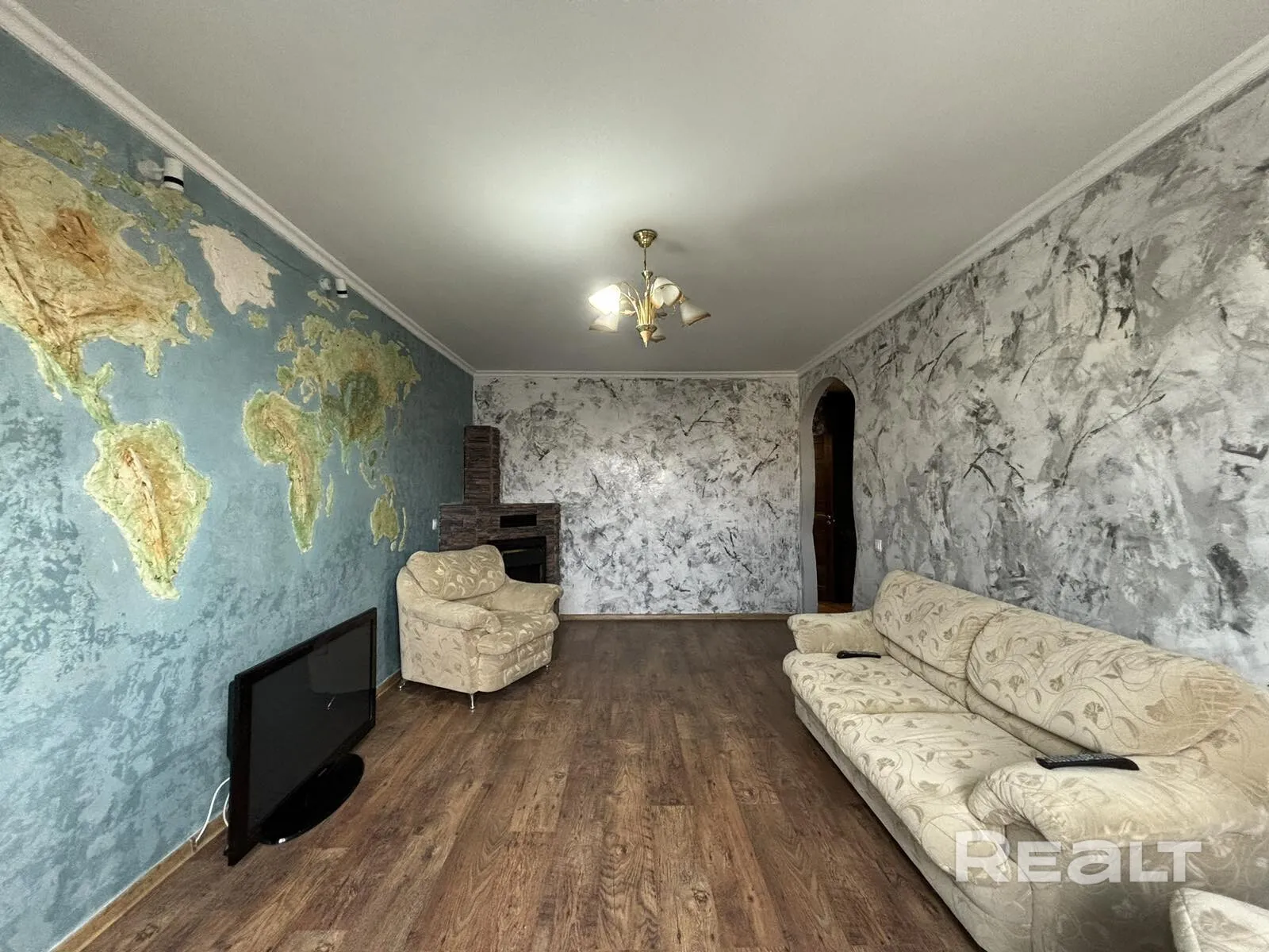 На седьмом этаже дома по улице Лиможа, 48Б выставлена на продажу трёхкомнатная квартира площадью 74,8 кв. м. В зале установлен декоративный камин с подсветкой, а на стене — объёмная карта мира.