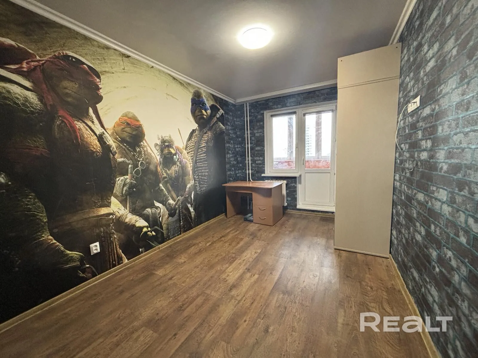 В квартире три изолированные комнаты, жилая площадь — 44 кв. м. Санузел раздельный, в ванной установлены и ванна, и душ. Спальни оформлены в разной стилистике, на стенах — декоративные покрытия. В одной из комнат — фотообои с персонажами «Черепашек-ниндзя».