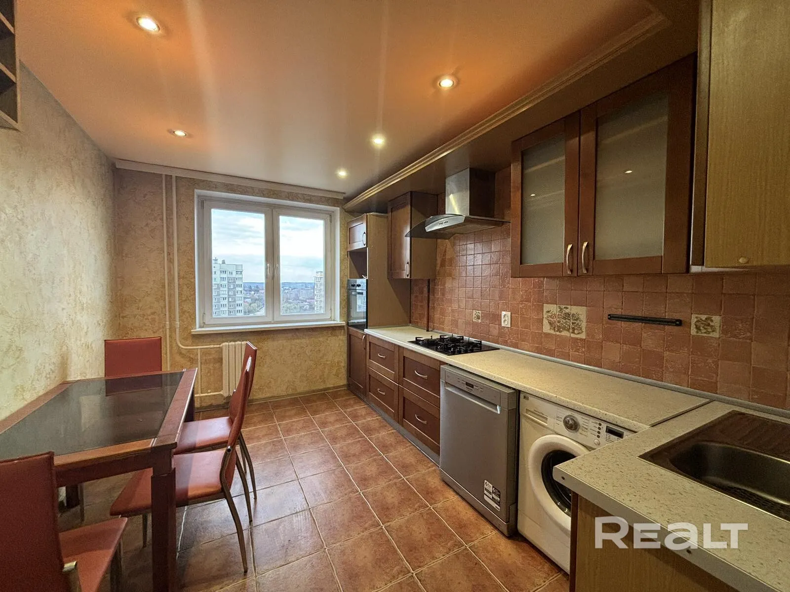 Кухонная зона полностью укомплектована техникой: есть духовой шкаф, посудомоечная и стиральная машины, вытяжка, холодильник. Гарнитур изготовлен из дерева по индивидуальному заказу. Обеденная зона включает стеклянный стол и четыре стула.