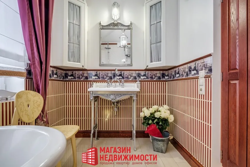 Внутри — камины, антикварные шкафы, много деталей: подсвечники, статуэтки, текстиль. На второй этаж ведет кованая винтовая лестница. Санузел оформлен плиткой с орнаментом и драпировками. Пространства много, много света, но интерьер требует бережного отношения. Подойдёт тем, кто ценит стилизацию и атмосферу, а не практичность.