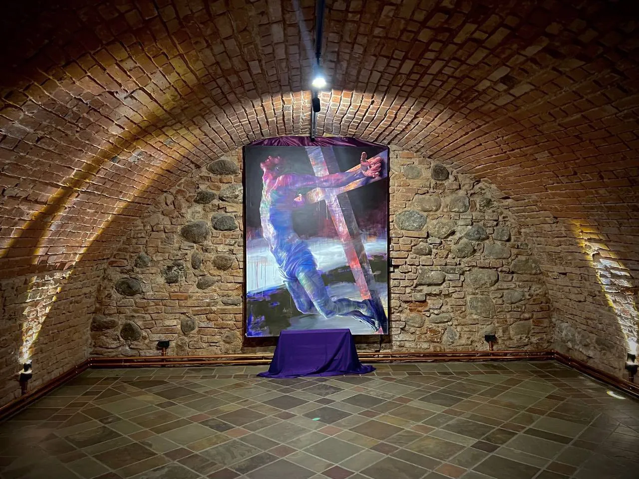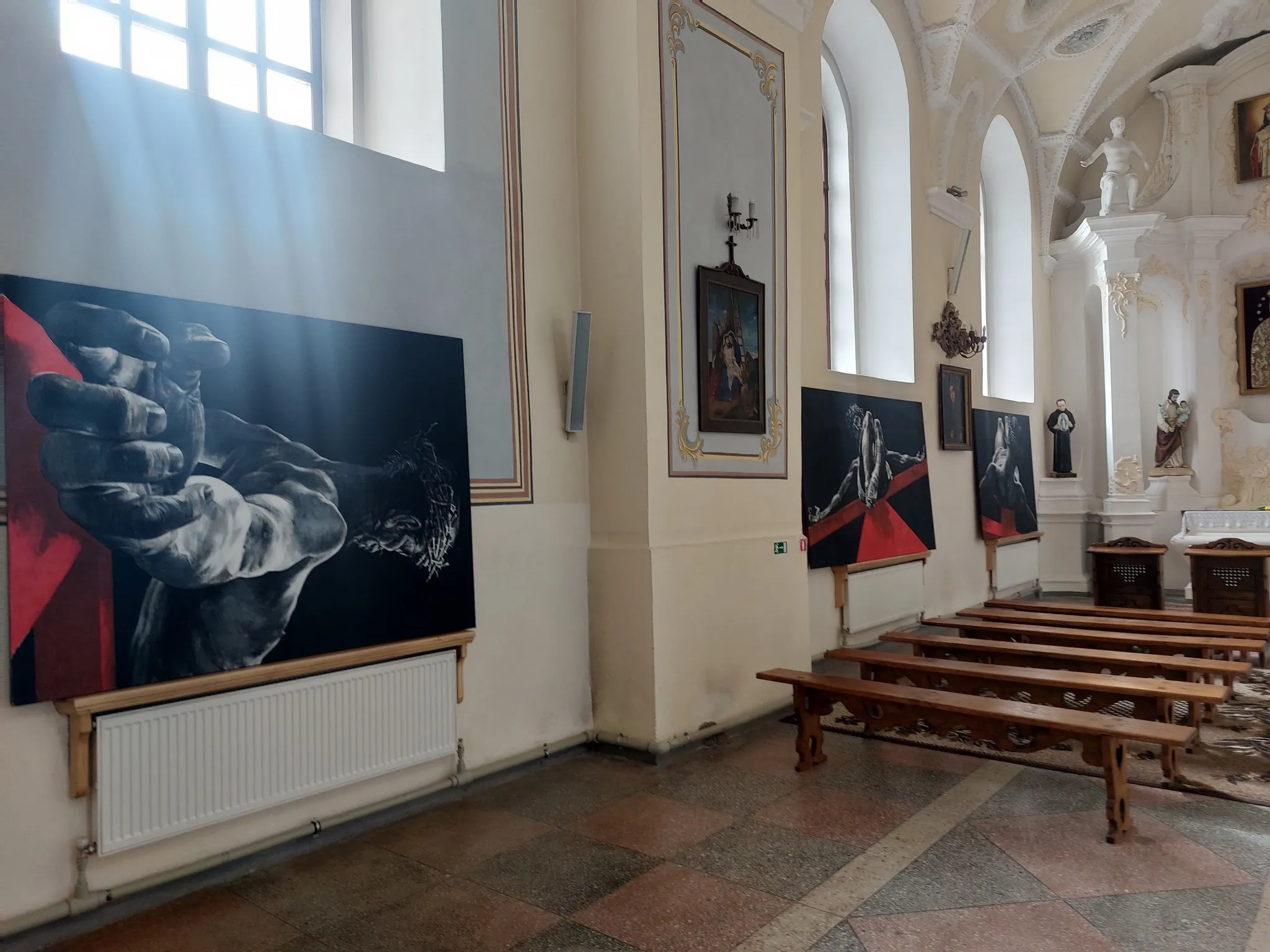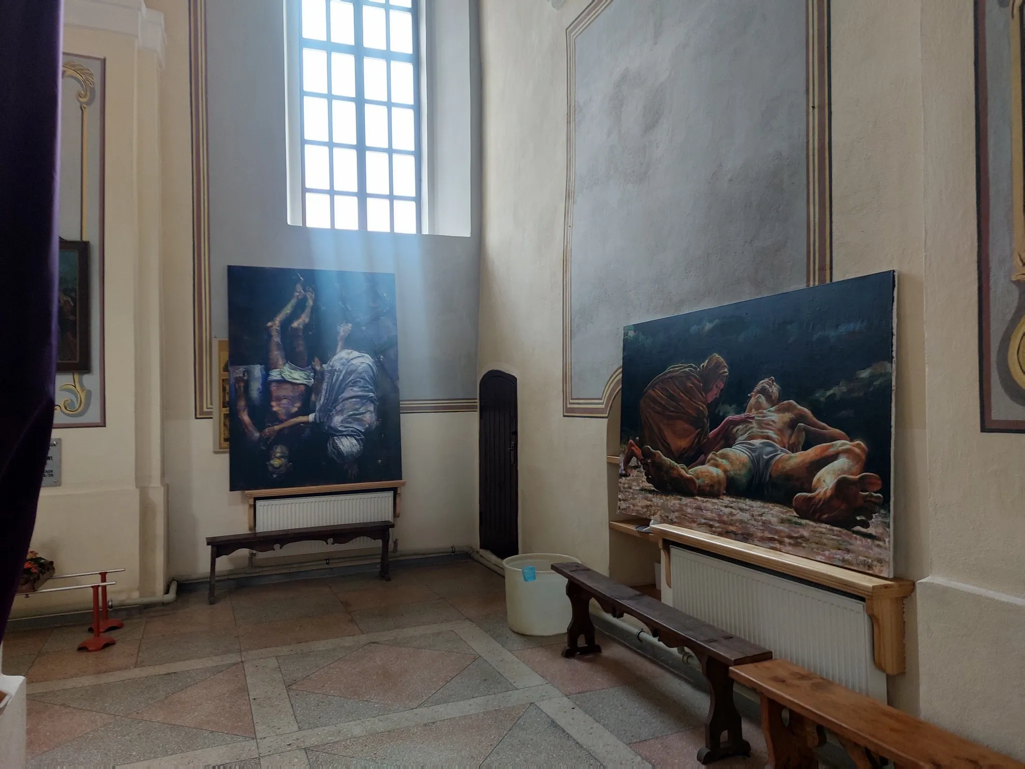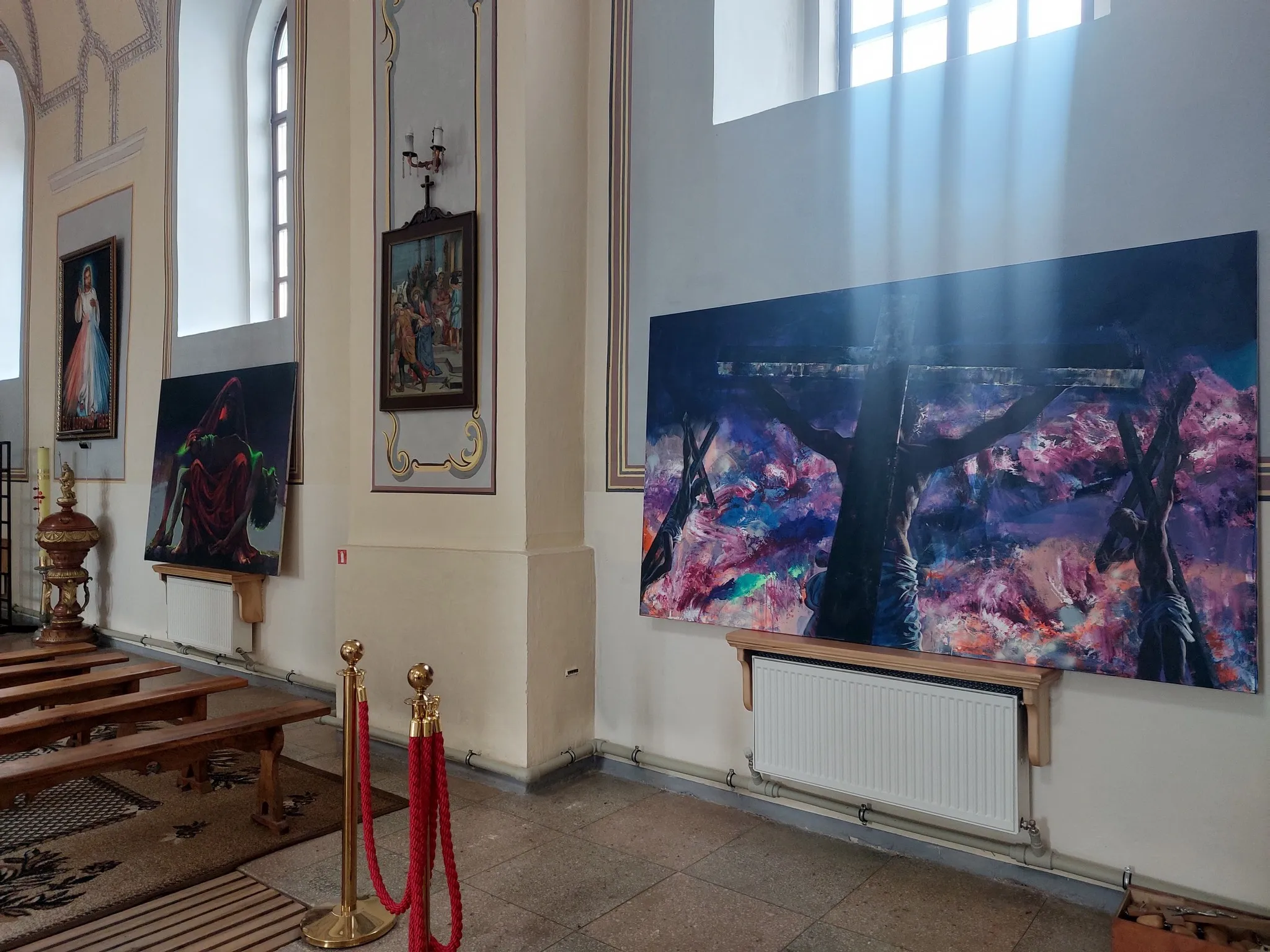 В костёле выставили и другие работы Сергея Гриневича, посвящённые распятию и снятию Иисуса Христа с креста. Среди них картина «Кальвария» (2024 год), триптихи Pieta и Crucifiction (2013 год).