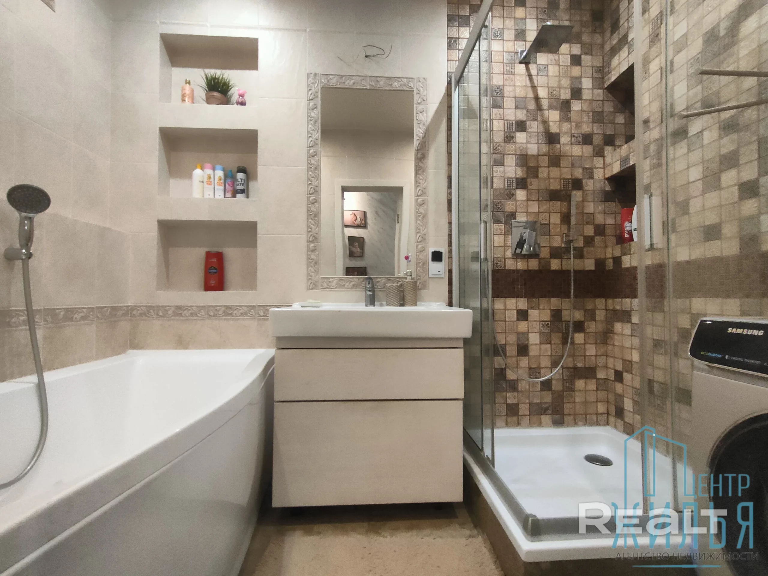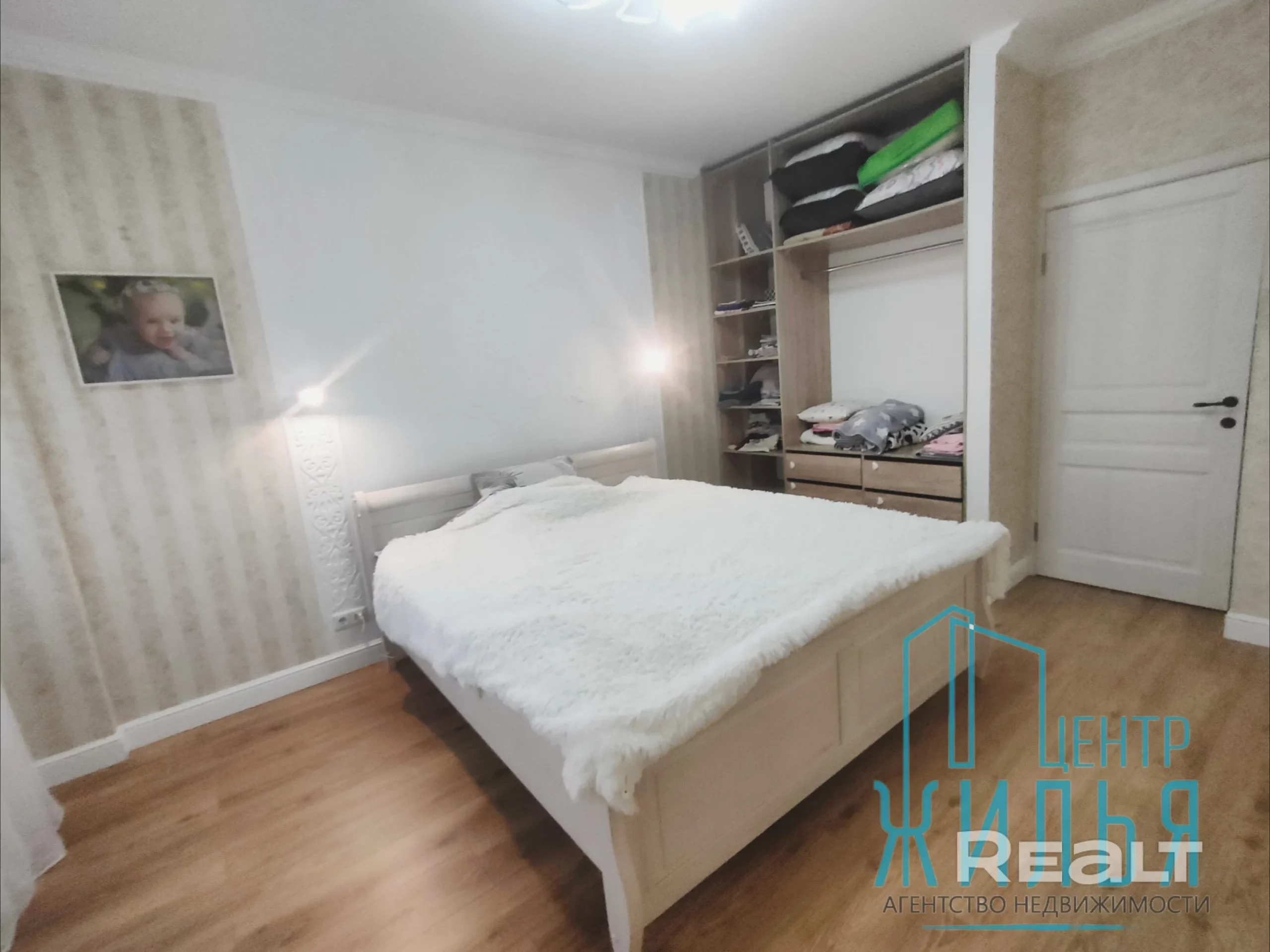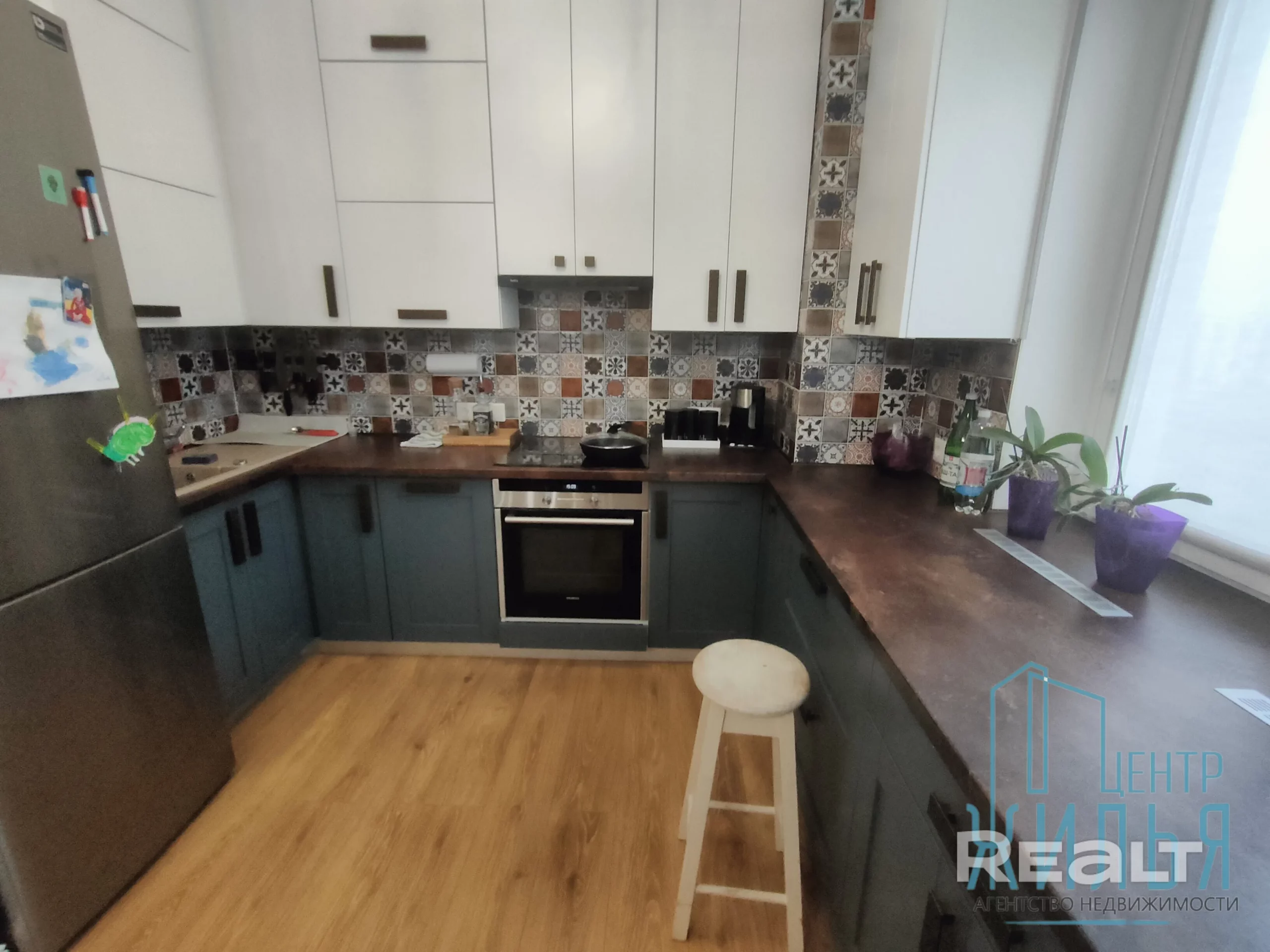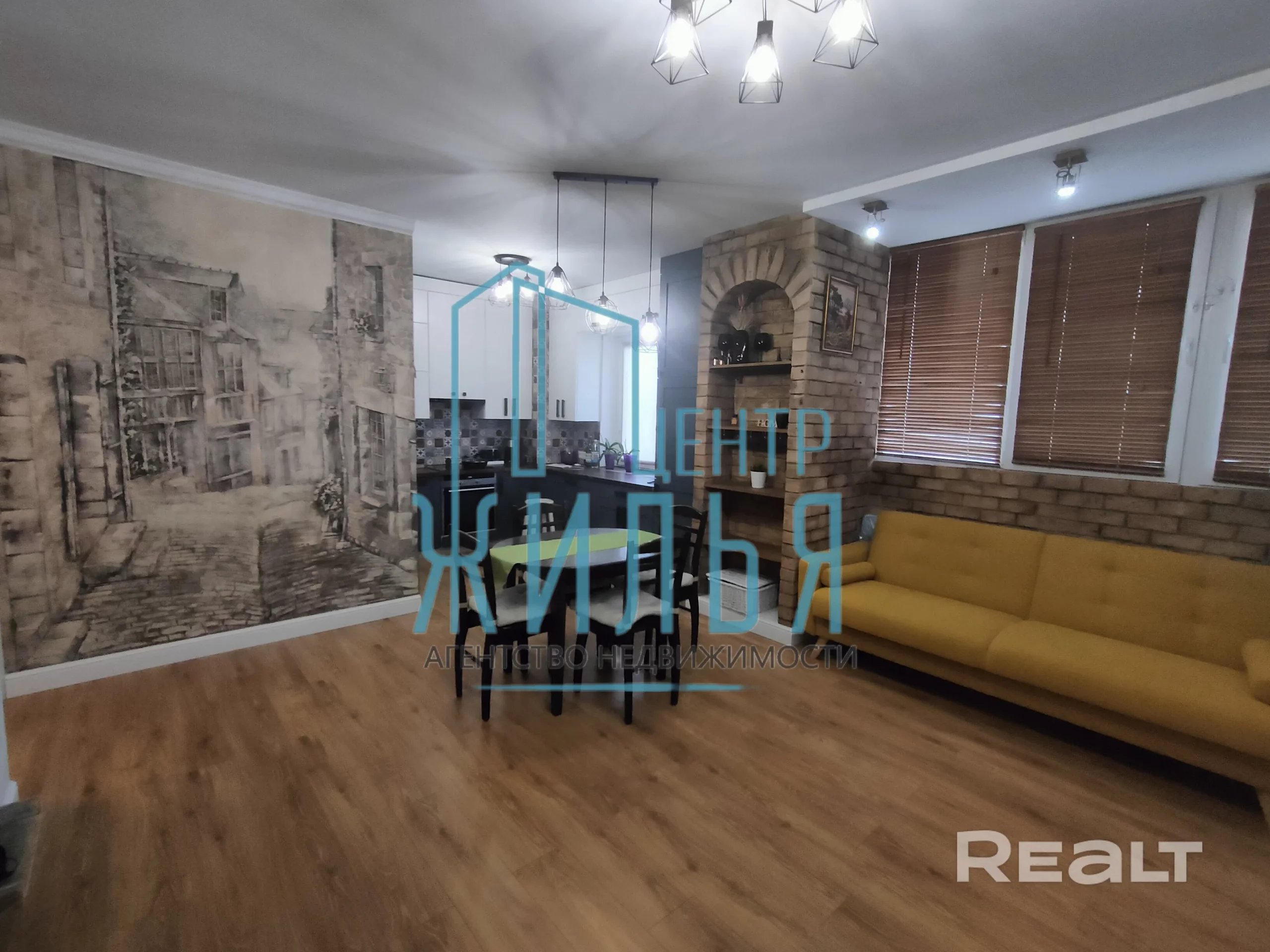 Квартира с ремонтом в стиле лофт. Пространство объединённой кухни и гостиной оформлено декоративным кирпичом и лепниной, разработанной белорусской художницей, на стене — стильный рисунок. В этой зоне установлен декоративный камин. Освещение регулируется: на кухне — две люстры и точечные светильники. Спальня и детская выполнены в спокойных оттенках, стены оклеены обоями.