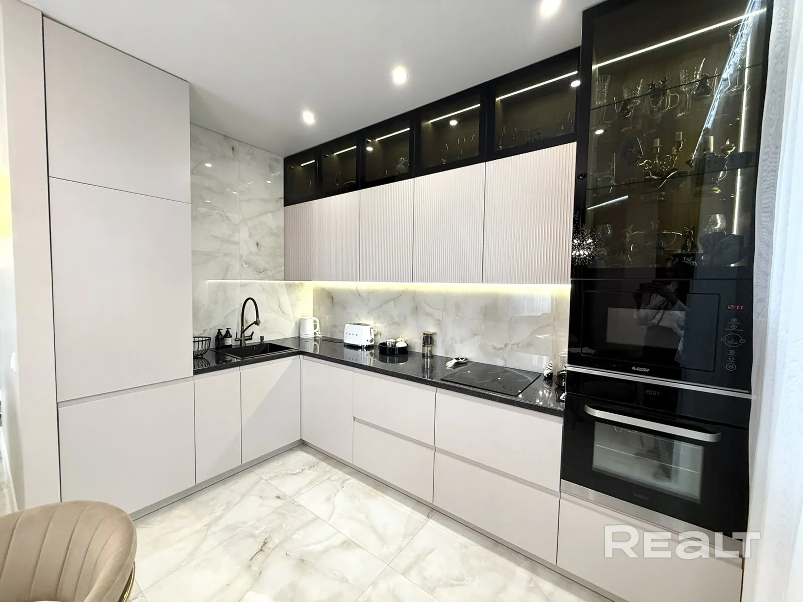 Кухня современная, с закрытыми фасадами и встроенной техникой. Фартук и стены отделаны плиткой под мрамор. В обеденной зоне — яркие светильники с декором в виде веточек.