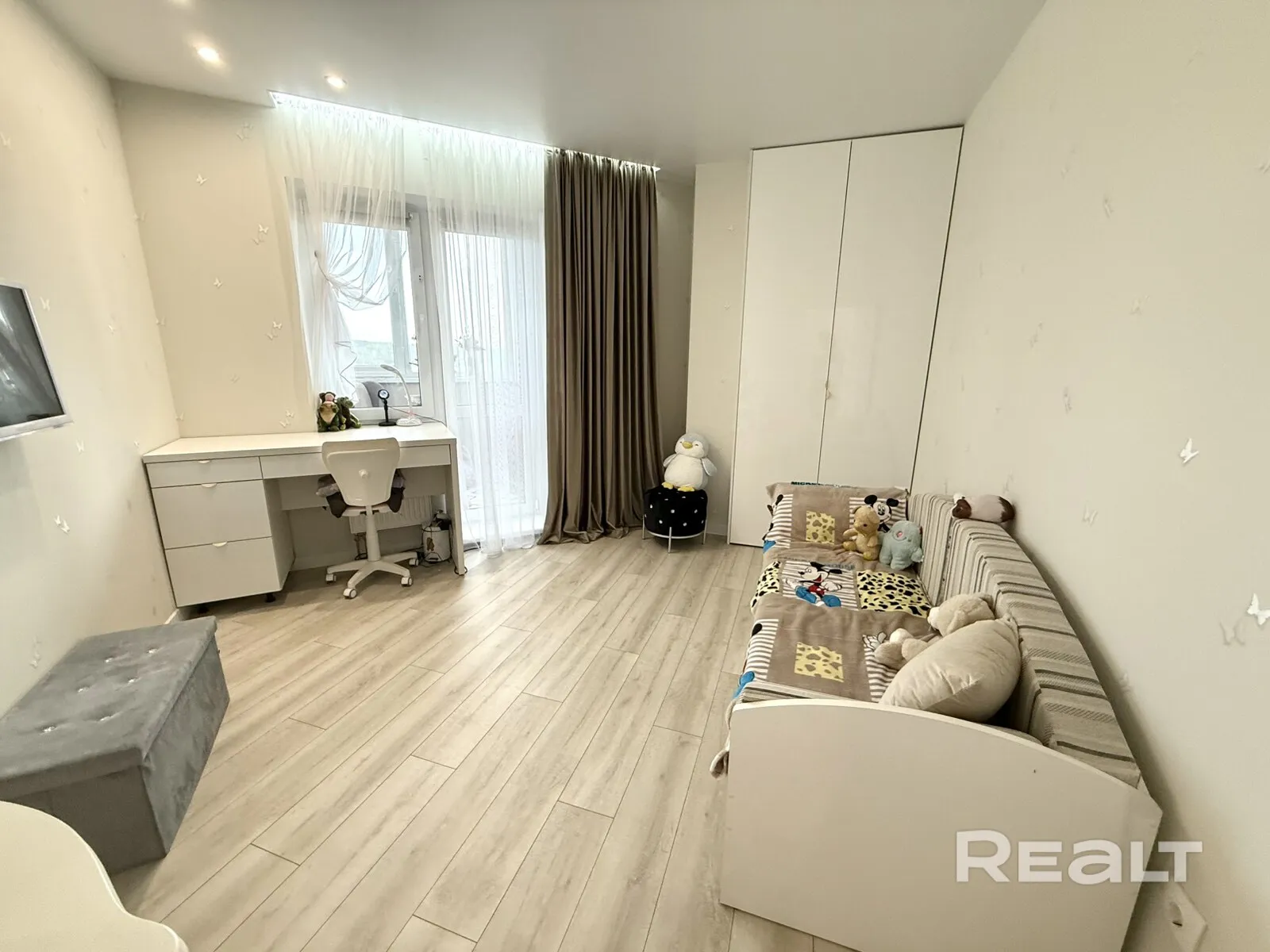 Спальня и детская оформлены в светлых нейтральных тонах. В детской — рабочее место с письменным столом и небольшой стилизованный туалетный столик.