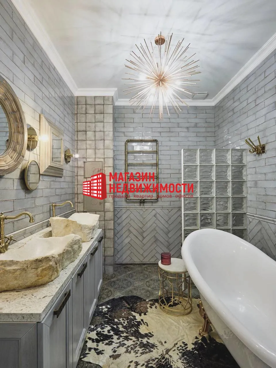 Санузел совмещённый. Ванная комната выделяется отдельностоящей ванной на ножках и раковинами из камня. Отделка — в серых и песочных тонах, с декоративной плиткой, зеркалами в массивных рамах и перегородкой из стеклоблоков. Есть лоджия и терраса с зоной отдыха.